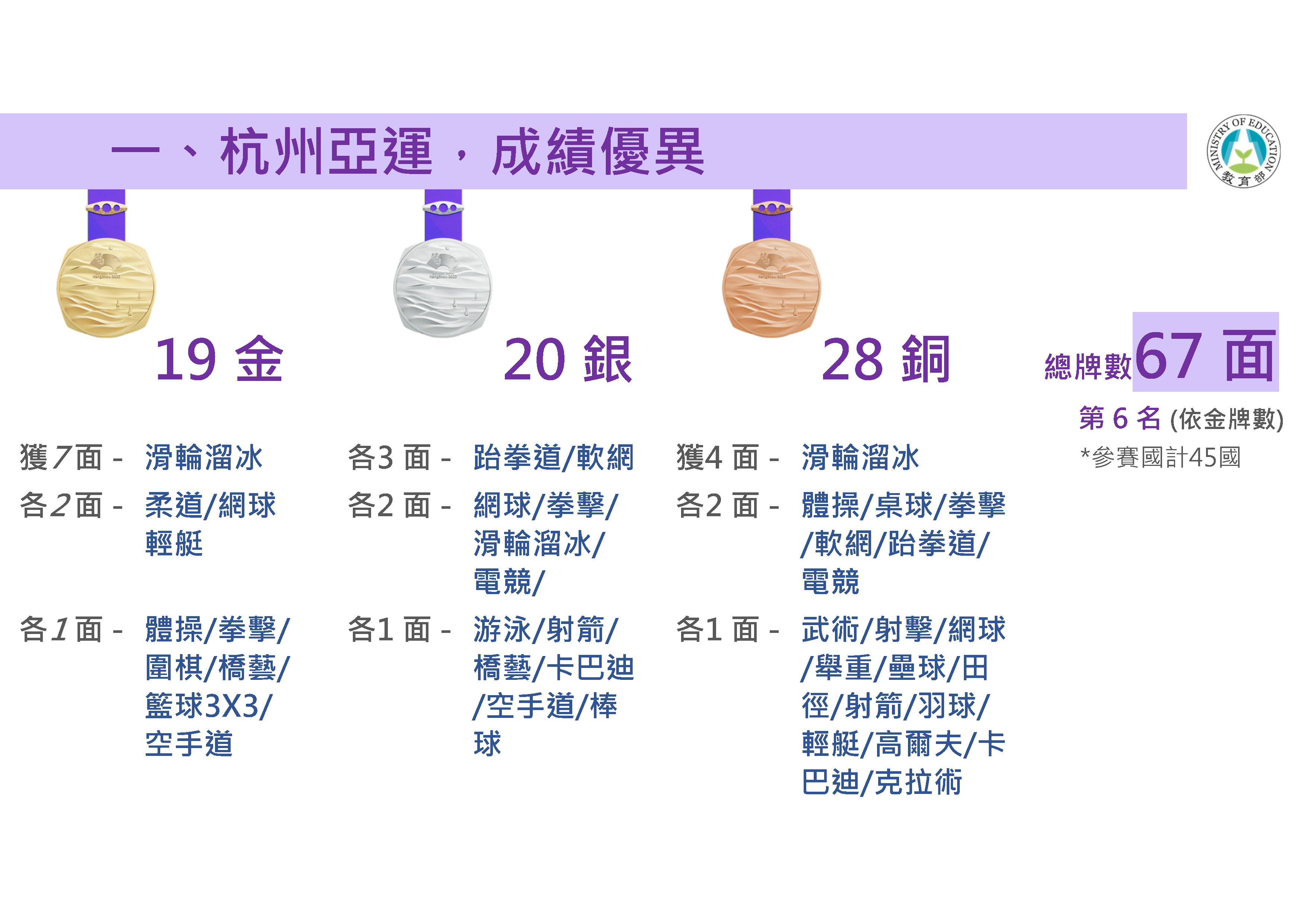 本屆亞運自2020年起分階段辦理培訓,培訓策略以銜接世大運梯隊及厚植奧運競爭基礎為方向,共計520名選手參加33種運動競賽,最終獲19金20銀28銅,超越上屆2018年雅加達-巨港亞運成績,也追平我國參加歷屆亞運以來,單屆金牌數最多的紀錄。