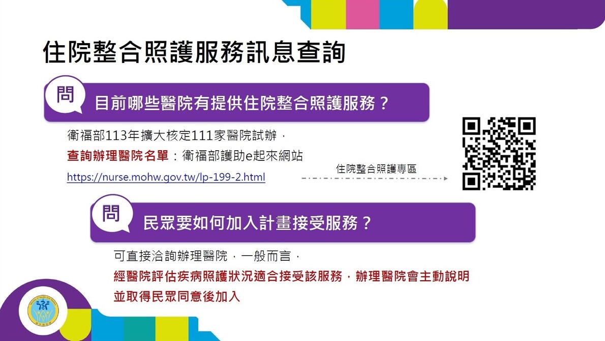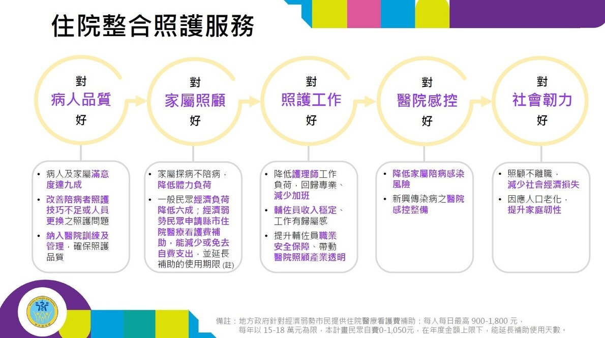 一、改善住院照顧困境,減輕家屬壓力:為解決民眾住院時家人無法陪病、請不到看護以及經濟負擔沉重等困境,衛福部自111年起透過健保推動住院整合照護服務,採取護理師與護佐人員的有效分工成組照護,讓家屬可免除全天候陪病或需額外聘請看護的壓力,同時提供病患連續且專業的照護,有效提升住院照護品質。
