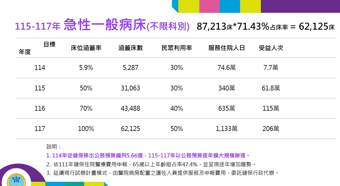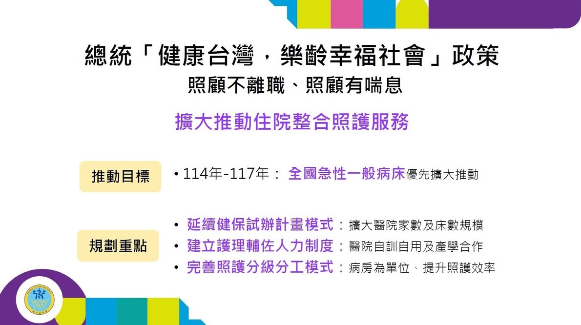 四、依循總統「長照3.0樂齡幸福社會」政策擴大推動:114年衛福部持續結合醫院推廣住院整合照護模式,115年-117年以公務預算逐年擴大規模辦理,急性一般病房床位涵蓋率由現行5.9%,逐年擴大為50%、70%到全面推動,實踐總統「打造健康台灣,樂齡幸福社會」之願景,並發展住院照護新生態,完善照護分級分工模式,解決民眾住院時家庭照顧的困境,共同協力讓台灣社會更有韌性。