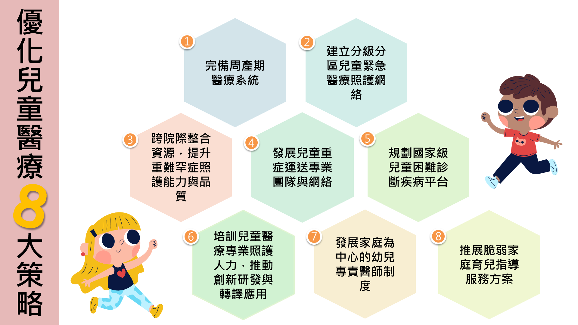 衛生福利部為挹注兒童照護資源,改善周產期與急重症醫療照護,並強化初級照護及健康管理,109年2月14日奉本院核定辦理「優化兒童醫療照護計畫(110年至113年)」,以改善周產期與兒童急重症醫療照護,降低兒童死亡率及增進兒童健康福祉。優化兒童醫療照護計畫8大策略如下: