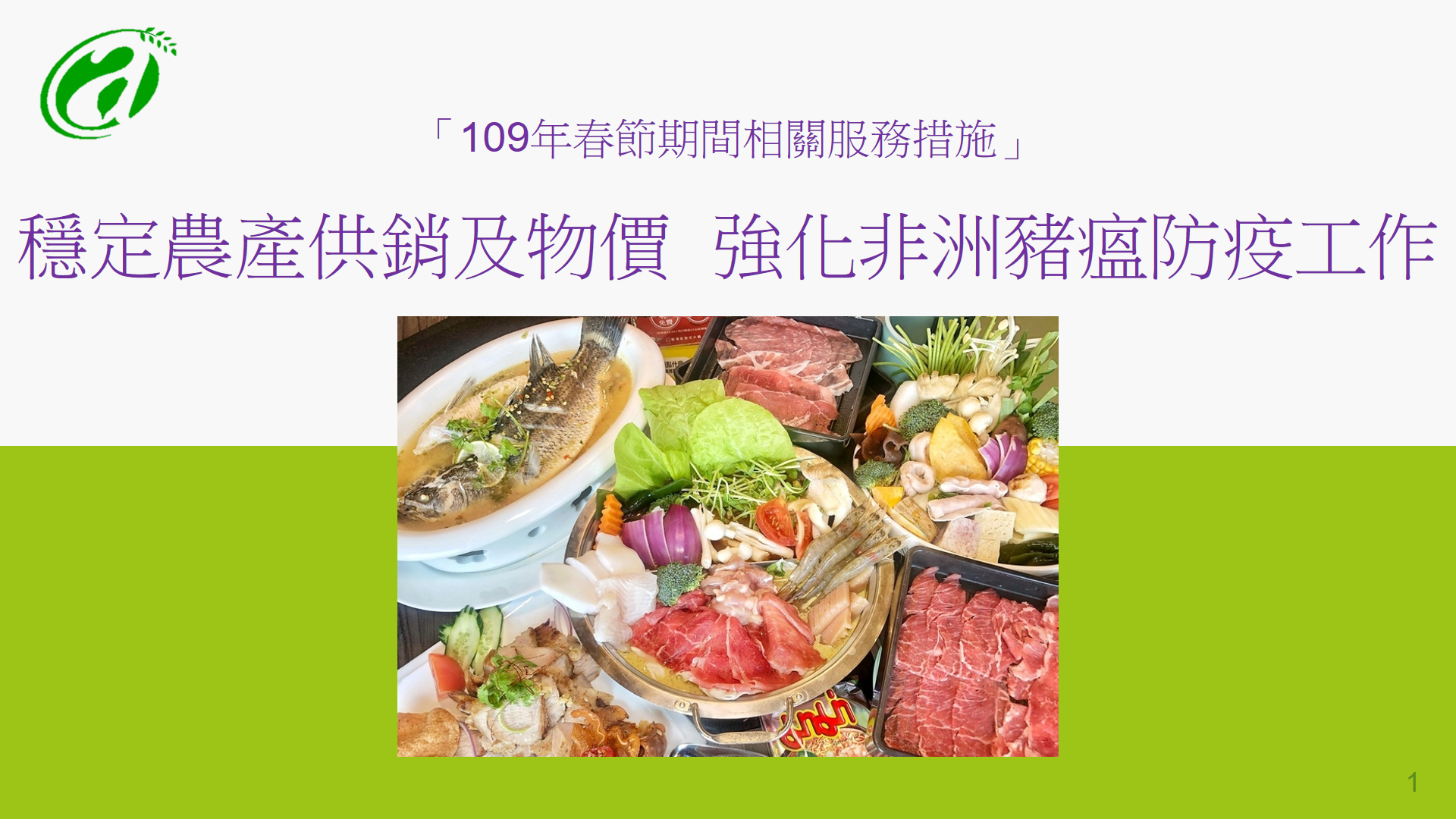 一、農曆春節是我國重要的圍爐團圓節日,節前魚肉、蔬果、花卉等需求將大幅增加,為充裕供應年節需求,平穩節前農產品價格,行政院農業委員會(下稱農委會)提前盤點相關應節農產品,加強規劃調配措施。