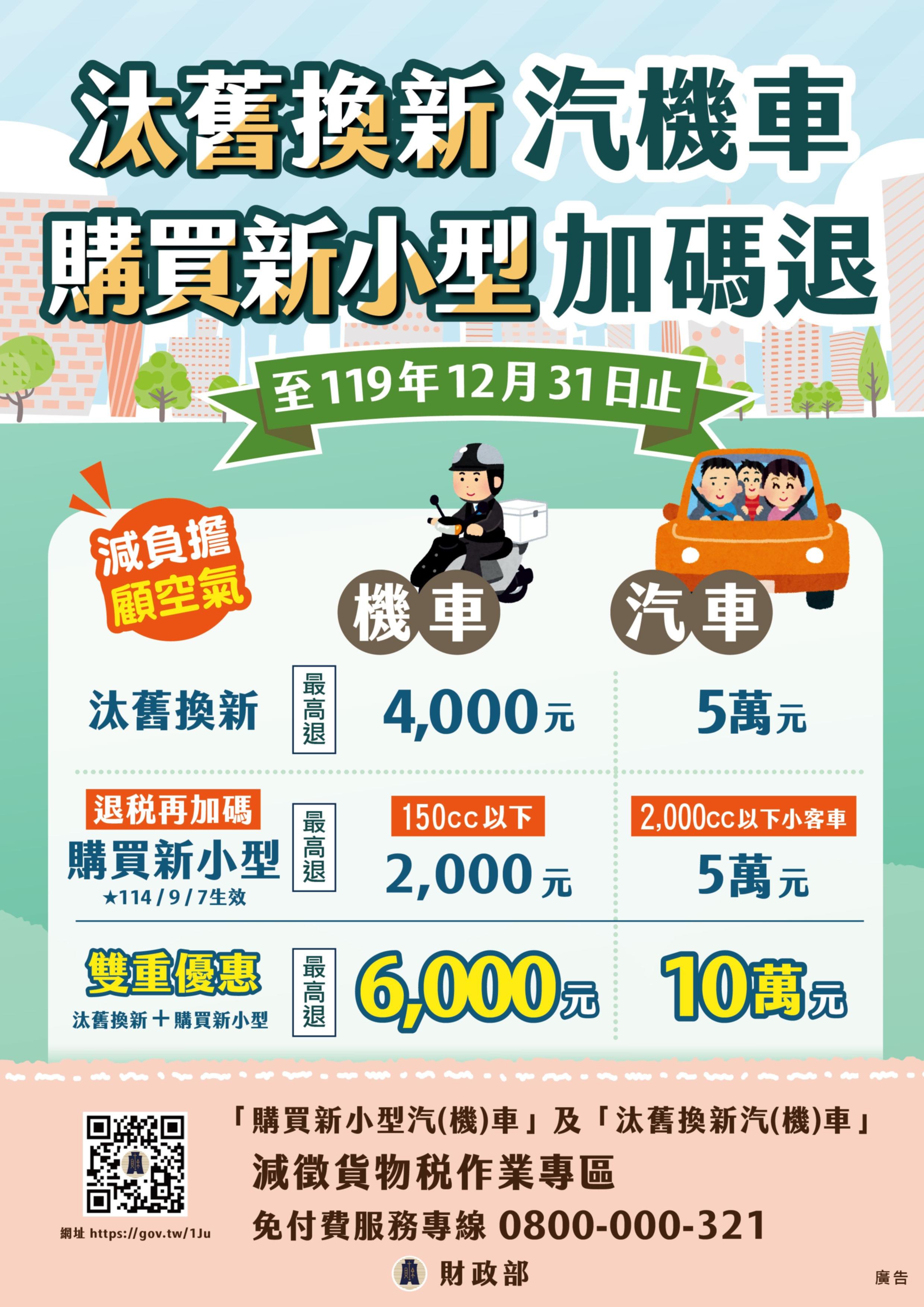 (三)自114年9月7日起至119年底購買2,000cc以下新小客車、150cc以下新機車分別減徵貨物稅最高5萬元、2千元,及延長中古汽、機車汰舊換新減徵貨物稅最高5萬元、4千元,以活絡車輛相關產業並兼顧節能減碳。