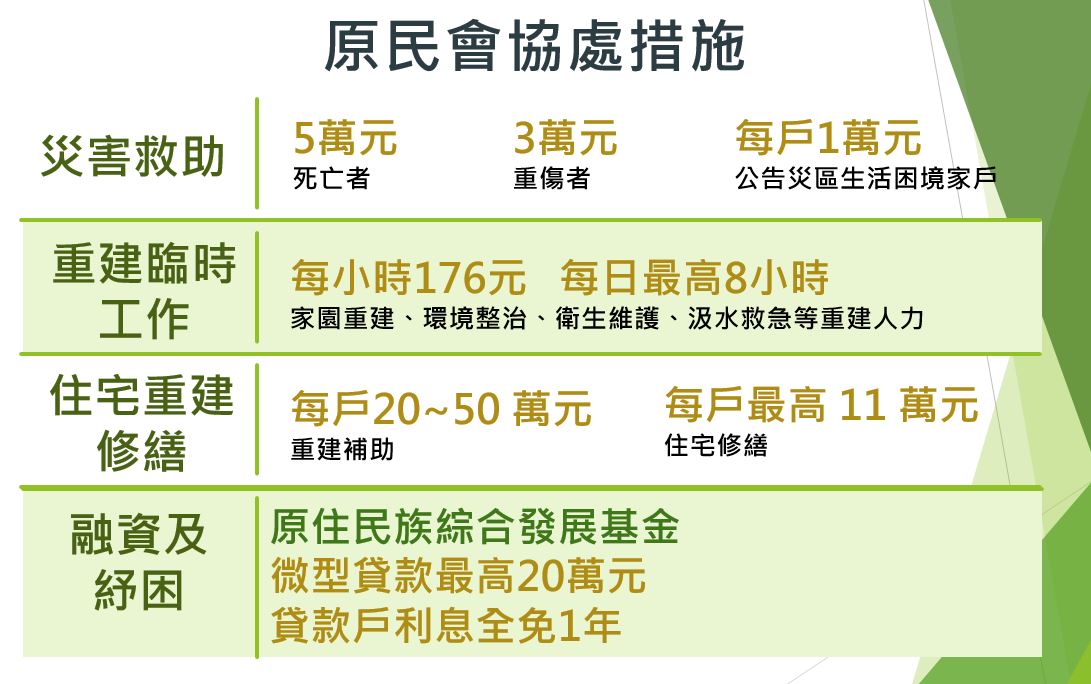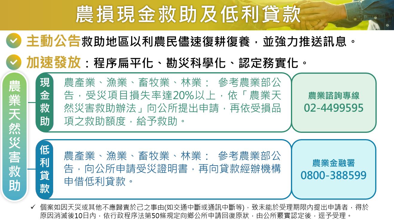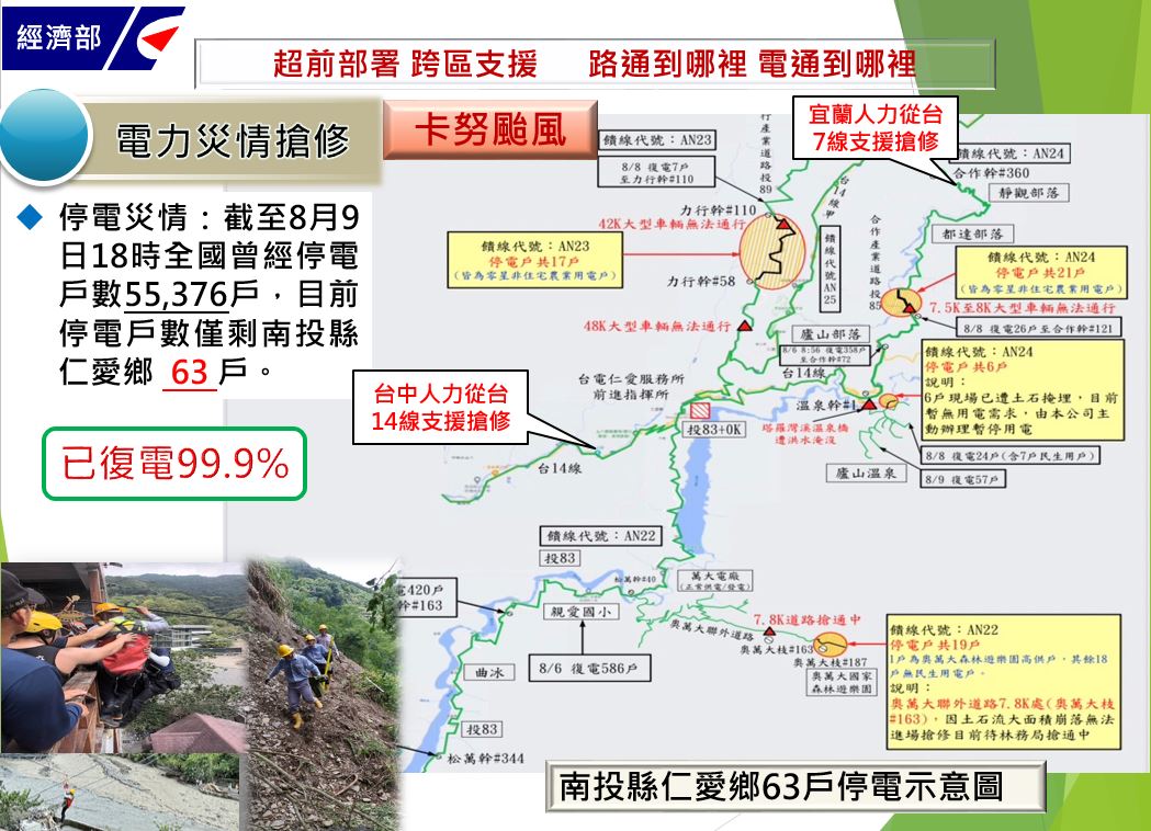近期杜蘇芮與卡努颱風以及伴隨季風環流為接連帶來劇烈降雨,尤其對中南部山區造成重大衝擊與影響,主要災情包括:土石流災情、道路坍方、孤島受困、大範圍停電、停水與電信基地台受損等災情,尤其卡努颱風造成台14線高達19處阻斷,以及台20線明霸克露橋因土石泥流沖毀,導致南投縣仁愛鄉及高雄市桃源區部分村落成為孤島,許多旅客及居民受困待援,救災應變難度相當高。有賴各級政府第一線救災人員,包括警消、空勤、國軍、公路以及台電、台水、電信業者等公民營事業機構,在強風驟雨的環境下,不眠不休,在最短時限內完成人命搜救、道路搶通搶險、物資運補及空投、恢復水、電、通訊等民生設施等任務。另外為穩定災後農產品民生供應,政府也嚴密監控農漁畜產品供應,適時啟動平穩措施。