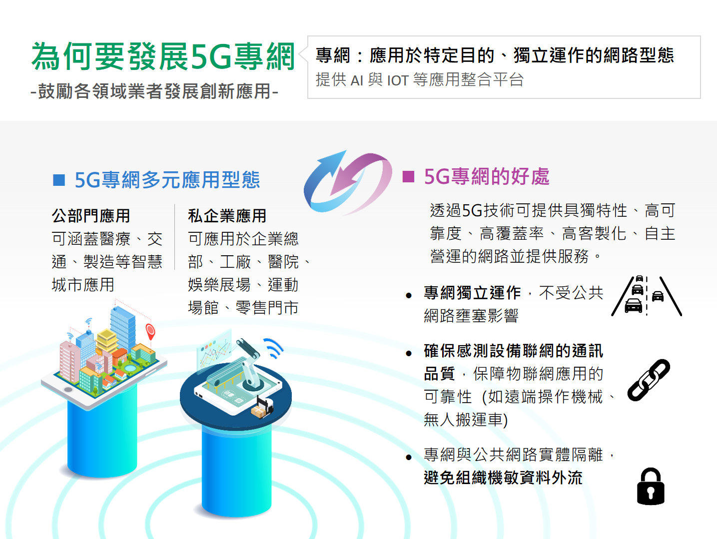 除了5G商用網路外,我國亦與日本、德國、英國等國家同步,規劃5G專網發展機制,期待藉此加速5G結合AI、IoT、資安等打造垂直場域應用,包括遠距醫療照護、環境氣候監測、智慧城市與居家安全,以及企業效率與工安等。透過5G技術提供具獨特性、高可靠度、高覆蓋率、高客製化、自主營運的網路並提供服務,提供在地性智慧城市服務,提升民眾醫療、安全、交通等領域的生活福祉,並形成垂直應用整合方案,可輸出國外,掌握5G產業契機。