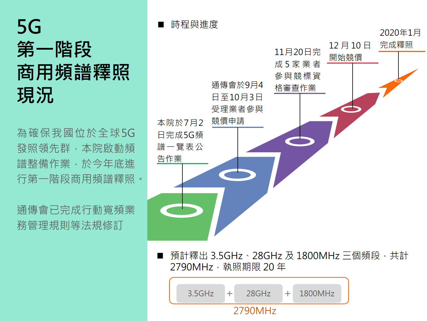 行政院自今(108)年啟動「臺灣5G行動計畫」以來,即著手協調相關部會規劃完備我國5G頻譜政策與專網發展機制,5G頻譜釋照將分階段逐步進行,目前通傳會正進行第一階段商用頻譜釋出作業,預計釋出3.5GHz、28GHz與1.8GHz三頻段,總計 2,790 MHz 頻寬,將於明(109)年1月完成釋照作業,台灣即將正式進入5G世代。