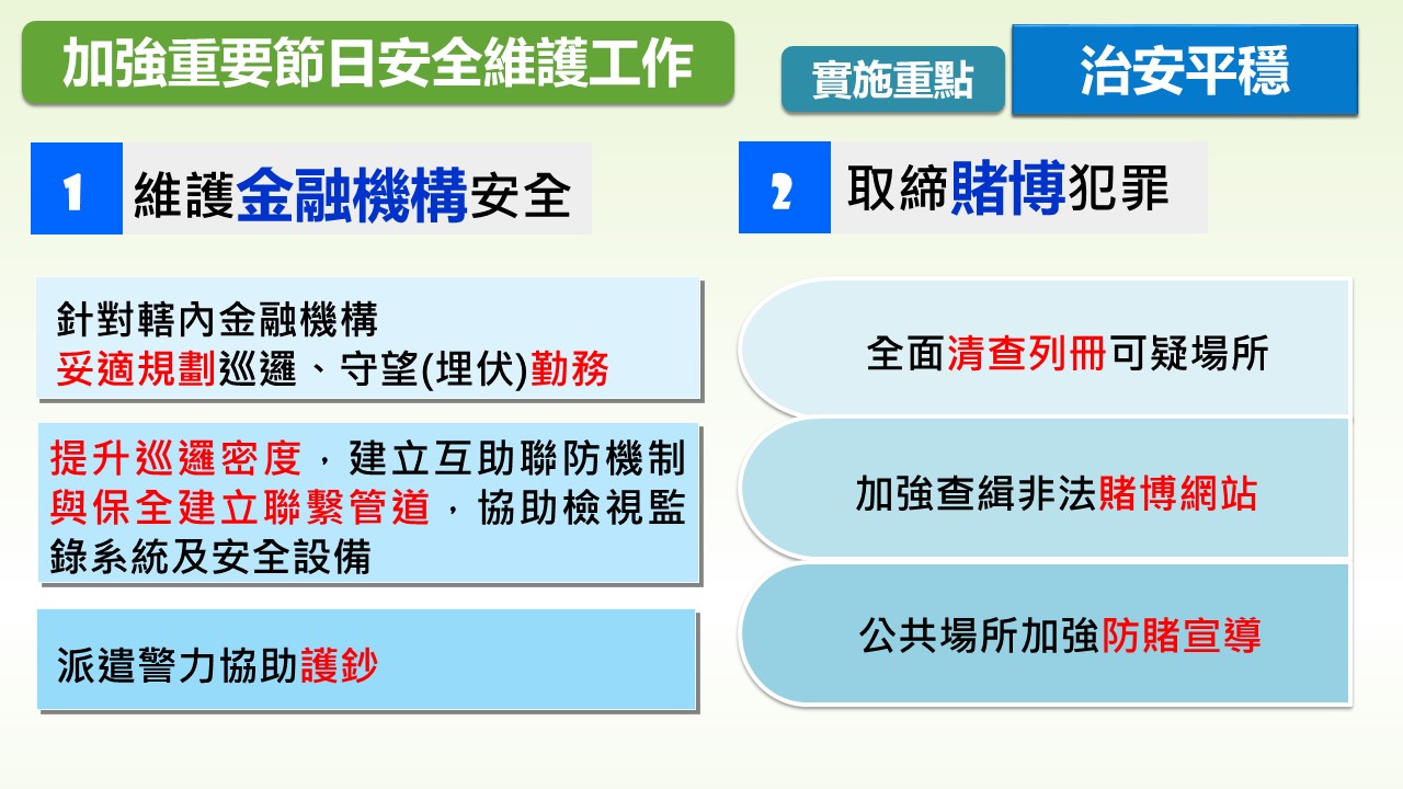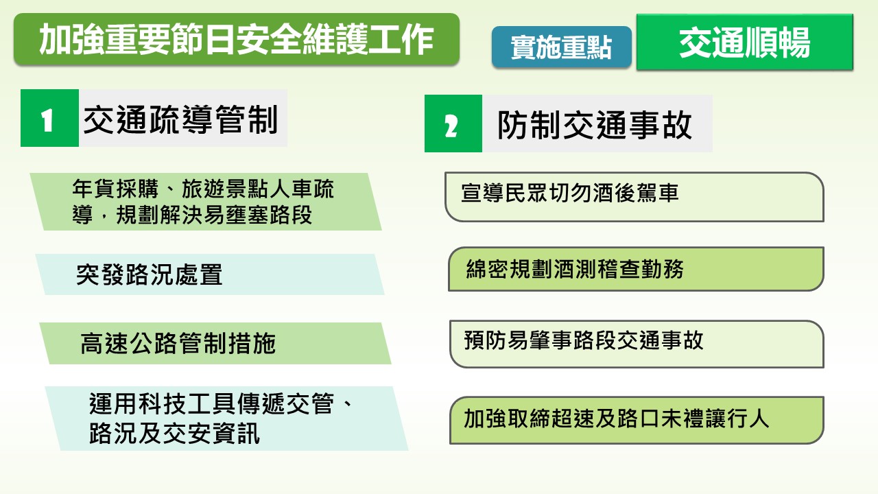 警察機關站在維護治安及交通的第一線,絕不因節日或連假而有絲毫鬆懈,同仁將堅守崗位,提供便利、優質、高效率、24小時的全方位服務,展現政府積極妥善維護治安及交通的決心,讓全國民眾安全、平順、安心過好年。