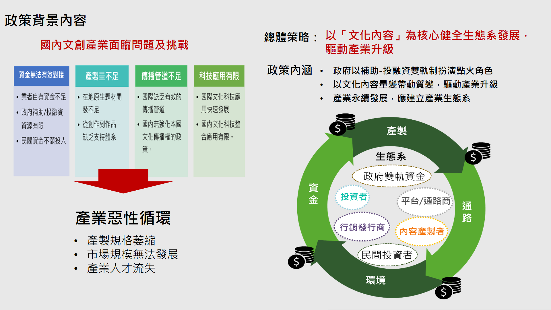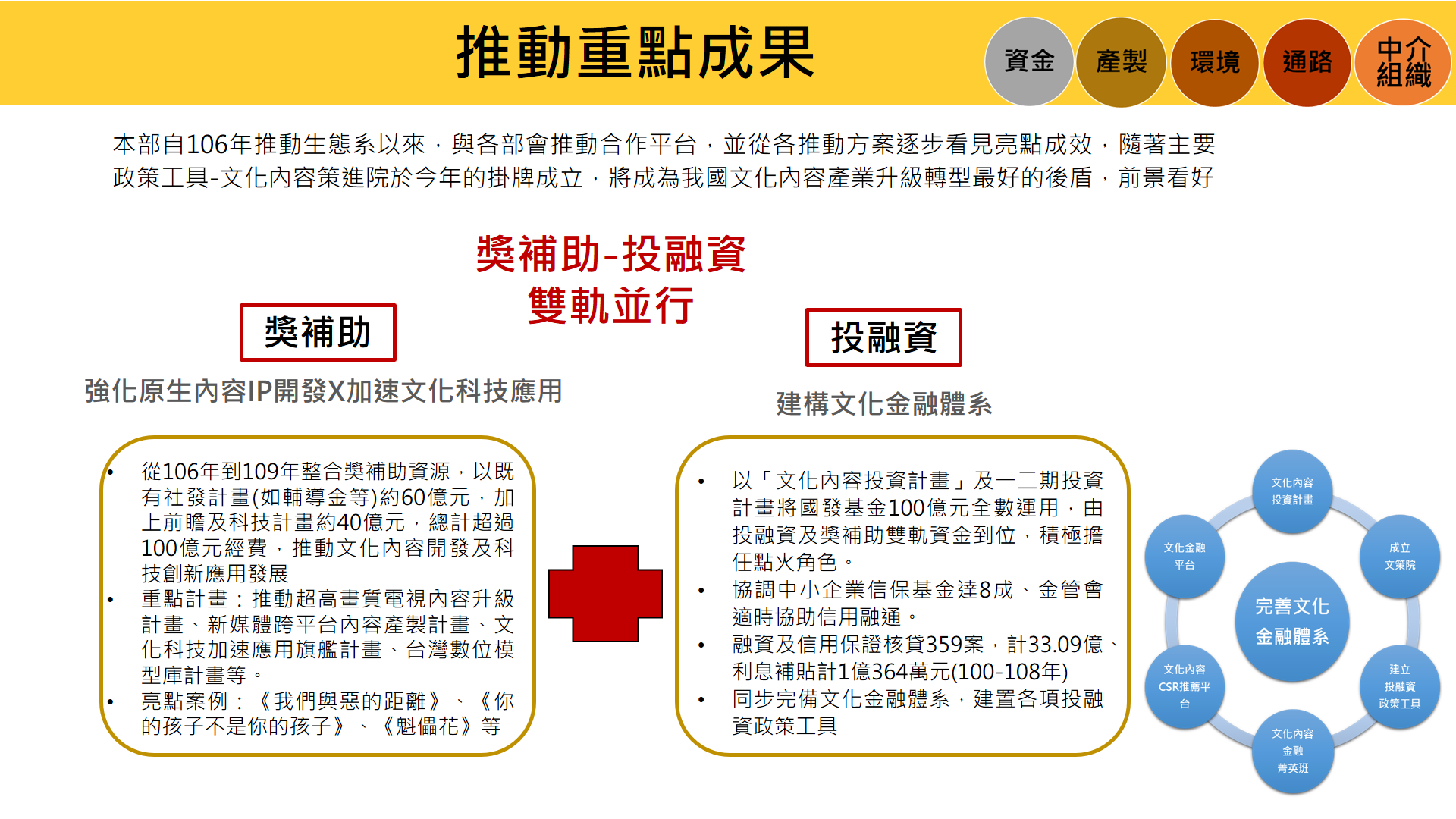 文化部已為我國文化內容產業架構出涵蓋產製、金融、環境、國家品牌的生態系統藍圖,並有多項成果,包括:推動獎補助/投融資雙軌並行的文化金融體系、建立多個跨部會合作工作平台、強化原生內容IP開發、加速文化科技應用整合、推動法規革新、完備內容產製基礎設施、形塑及推展國家文化品牌等。今年6月成立的文化內容策進院,也將扮演文化部最重要的協力夥伴,以行政法人中介組織身分,整合文化、科技及經濟的能量,聚焦促進投融資,點燃產業動能,催生民間投資。文化部並將藉由文策院鏈結民間資源共組國家隊,在國際上建立臺灣文化傳播的話語權,以文化軟實力走向世界。