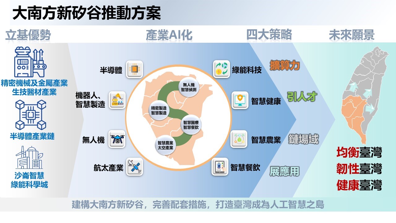 南部是臺灣半導體、生技醫材、精密機械、光電綠能產業之重要基地,發展AI產業有極大優勢,「大南方新矽谷推動方案」就是以臺南沙崙為核心,規劃以「擴算力」、「鏈場域」、「引人才」、「展應用」等4大策略布局,將AI科技的能量注入全產業,並串聯從嘉義到屏東的半導體S廊帶,帶動百工百業數位轉型。另外,本方案亦致力推動學研單位與產業協會合作,強化AI在中小企業的應用,透過需求導向的系統設計與場域實驗,聚焦「需求分析能力」和「自主AI系統設計能力」,藉由整合機制建立,串聯需求面、產業面和人才面,將數位轉型與AI技術應用於各產業,以提升產業競爭力。