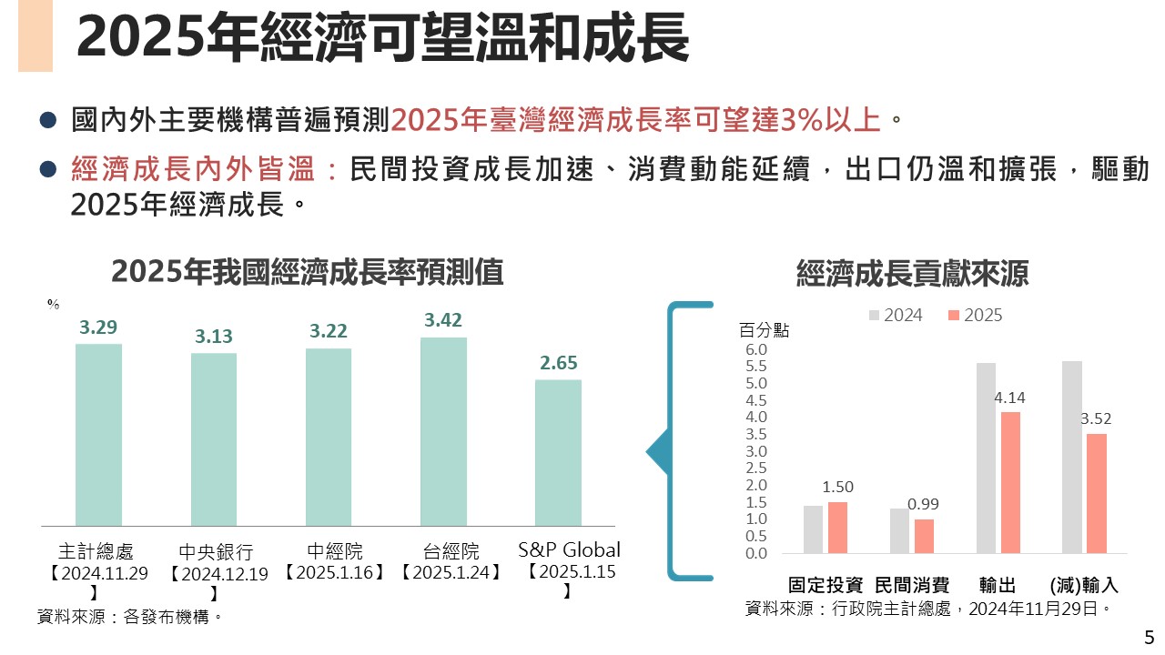 行政院院會今(13)日由國家發展委員會報告「2025年總體經濟情勢及未來展望」。現階段臺灣經濟基本面強韌,儘管國際經濟下行風險仍存,惟隨我國外貿逐步回溫、內需穩定擴增的帶動下,今(2025)年臺灣經濟表現可望逾3%。政府將攜手各界持續共同努力,在不確定的全球局勢中穩步前行