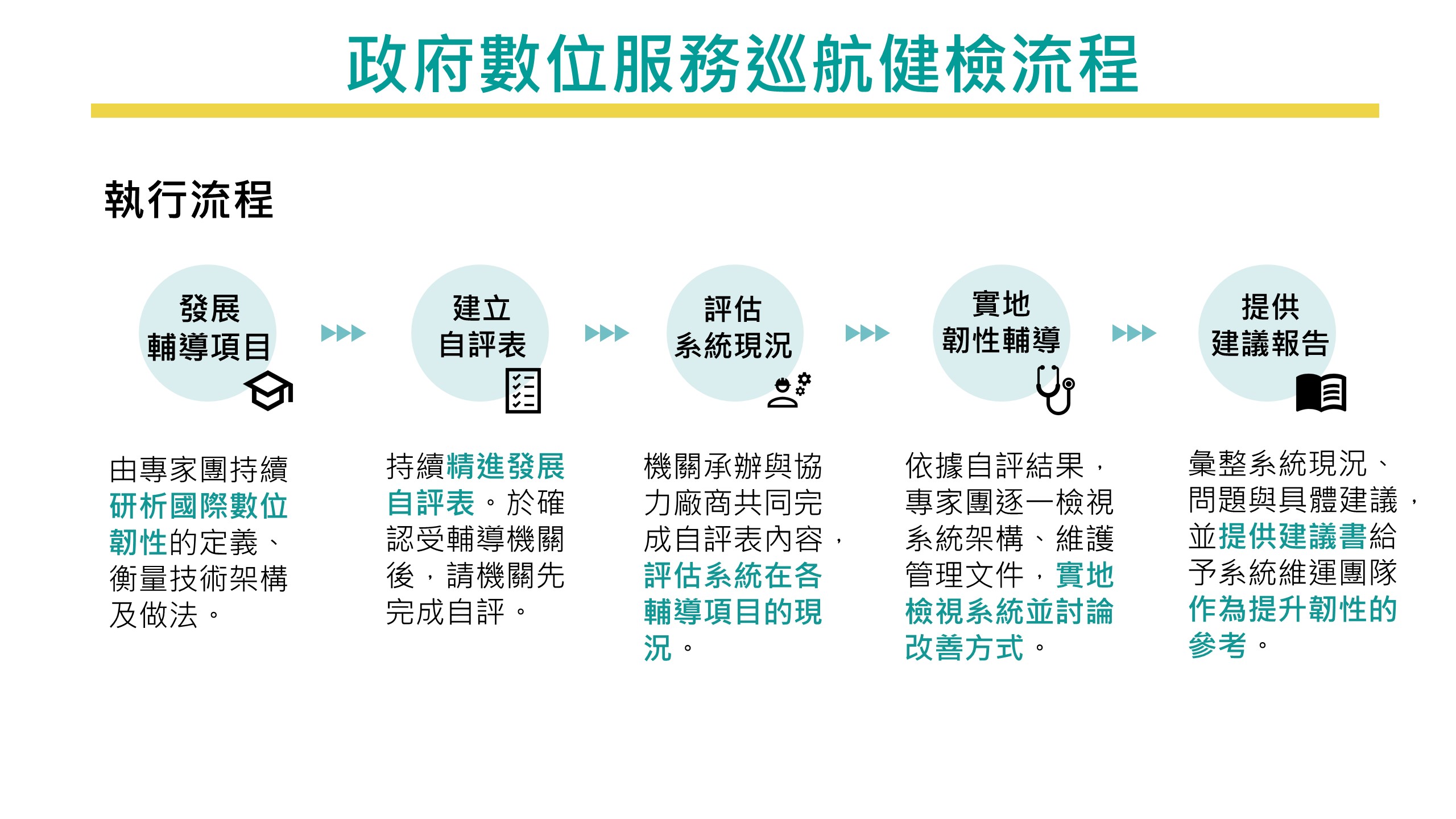 為建設臺灣成為「堅韌之島.韌性國家」,數位部積極辦理「政府數位服務巡航健檢」,偕同專家團於112年完成23個政府機關(單位)資訊系統的數位巡航健檢作業,並優先選擇具民生關鍵資訊系統的政府機關,從設計面、執行面與管理面提供改善建議,使政府數位服務能更妥適地因應疫後及地緣政治下全球風險與挑戰,有利於維持社會安全及政府數位服務穩定運行。