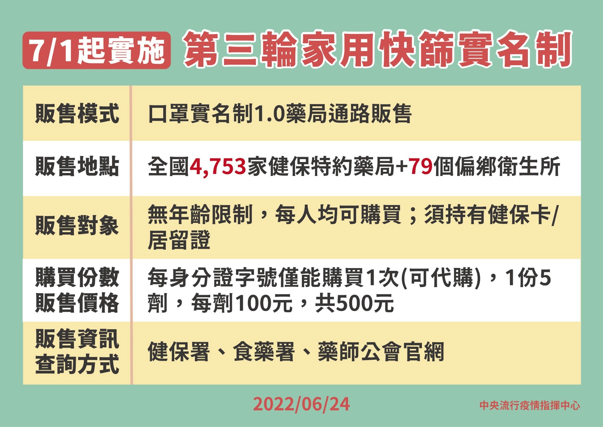 (一)鑑於COVID-19國內疫情處於高原期,民眾仍有使用家用抗原快篩試劑之需求,自7月1日起,實施第3輪家用抗原快篩試劑實名制販售,延續第2輪做法,每個販售據點每天配送份數117份,以及取消單雙號的購買限制,有需求民眾可以多加利用;