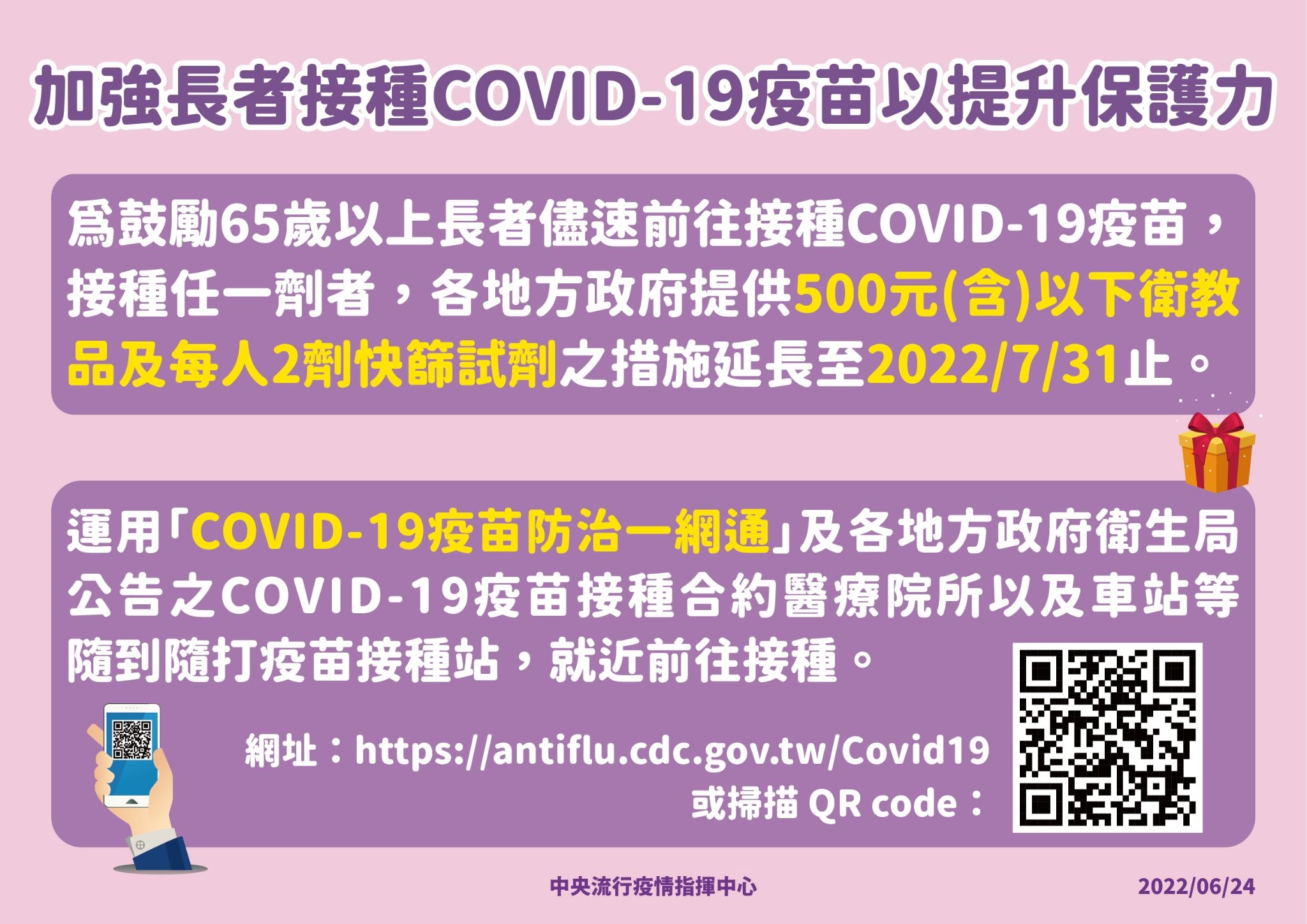 二、加強鼓勵長者接種疫苗:全球及國內COVID-19疫情仍持續,國際Omicron新型變異株繼續發生,對社區造成威脅,未完成接種 COVID-19疫苗之長者,染疫後發生重症和死亡的比例較高,為持續鼓勵長者接種,各地方政府提供65歲以上(含55歲至64歲原住民)尚未完成接種COVID-19疫苗民眾500元(含)以下衛教品及每人2劑快篩試劑措施延長至7月31日止。在此呼籲尚未接種第1、2劑、基礎加強劑及第1與第2次追加劑COVID-19疫苗之長者,儘速完成接種,以獲得保護力。