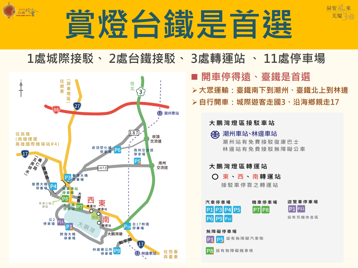 交通部觀光局表示,為響應燈會節能環保訴求,建議遊客盡量搭乘公共交通運輸工具遊賞燈會及到附近旅遊景點遊玩,「2019燈會」相關資訊請至交通部觀光局或屏東縣政府建置的活動網頁查詢。