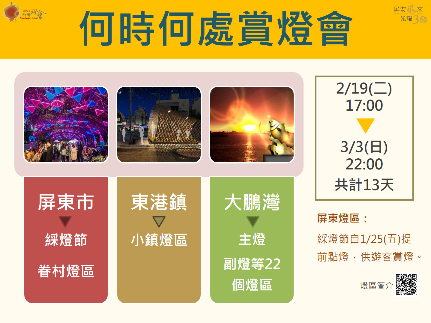 今年邁入第30屆的「2019台灣燈會」以「屏安鵬來 光耀30」為布展主題,共分為屏東、東港及大鵬灣三大燈區,各自展現其特色吸引國內外遊客到訪,其中主燈所在的大鵬灣燈區,是台灣燈會首次於國家風景區舉辦,其獨特的潟湖海岸地形是國內、外少見的燈會舉辦場地,燈區充分利用當地特殊地景地貌規劃,民眾除了可以細細欣賞燈藝師精巧別緻的製燈工藝與感受年節歡樂氣氛外,更可以漫步於燈區沿岸,聆聽海的聲音、感受海的味道與開展視覺的遼闊。