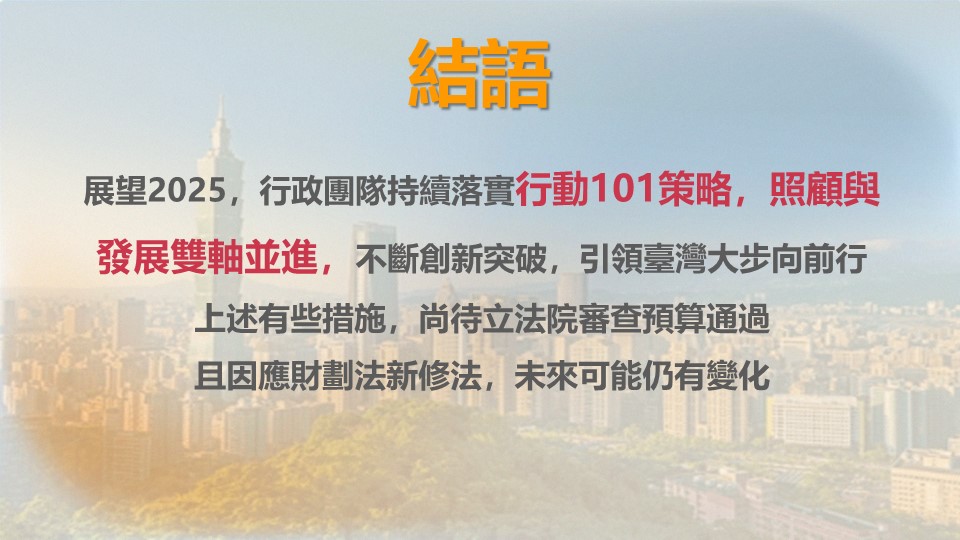 在「照顧」方面,勞工最低工資上路,同時為連續第9年調漲,明年月薪由2萬7,470元調整至2萬8,590元,時薪由183元調整為190元,約257萬名勞工受惠。軍公教調薪3%,係自2018年來第4度調薪,實質薪資提升14.7%;另中央機關約僱人員、工友及約用人員之月薪調整至不低於最低工資1.1倍(約3萬1,449元)。 調高2024年基本生活費用及2024年度綜合所得稅免稅額、標準扣除額、薪資所得、身心障礙、幼兒學前、房屋租金支出特別扣除額等減稅優惠,約687萬戶受惠,明年5月申報綜合所得稅時適用;因應消費者物價指數上漲,調高2025年遺產稅、贈與稅之課稅級距金額;調增小規模營業人營業稅起徵點,「銷售貨物」業別由8萬元調高至10萬元,「銷售勞務」業別由4萬元調高至5萬元,約12萬家受惠;延長購買復康巴士及載運輪椅使用者車輛免徵貨物稅至2029年。 推動「青年百億海外圓夢基金計畫」,透過「築夢工場組」、「海外翱翔組」、及「年度旗艦計畫」三大實踐途徑,提供大專校院學生及青年海外學習機會,鼓勵青年開拓國際視野。 提高重要癌症篩檢率,擴大肺癌、乳癌、子宮頸癌及大腸癌等之公費篩檢對象及年齡範圍,並新增婦女人類乳突病毒篩檢項目。 延長300億元中央擴大租金補貼至2026年,補貼戶數並由50萬戶提升至75萬戶。 提高托育人員薪資、準公共托嬰中心及準公共居家托育人員獎助金額。 放寬自動查驗通關系統申請及使用資格,有戶籍國民申請使用自動查驗通關系統年齡自12歲以上調降至10歲以上,身高限制自140公分以上調降至120公分以上,並開放無戶籍國民得以「免許可」申請及使用自動查驗通關系統;在臺設有戶籍且已成年人,護照已逾期且資料頁記載事項不需變更之民眾,可全面使用自然人憑證(或行動自然人憑證)上網申請換發護照。