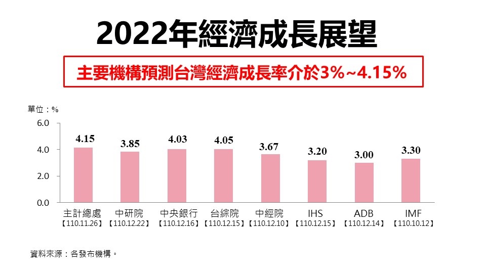 展望2022年,受惠內需消費動能回溫、國內外廠商賡續投資臺灣,以及全球新興科技趨勢帶動出口等內外需挹注下,在2021年的高基期下,2022年仍將繼續成長,行政院主計總處預估我經濟成長可望超過4%。