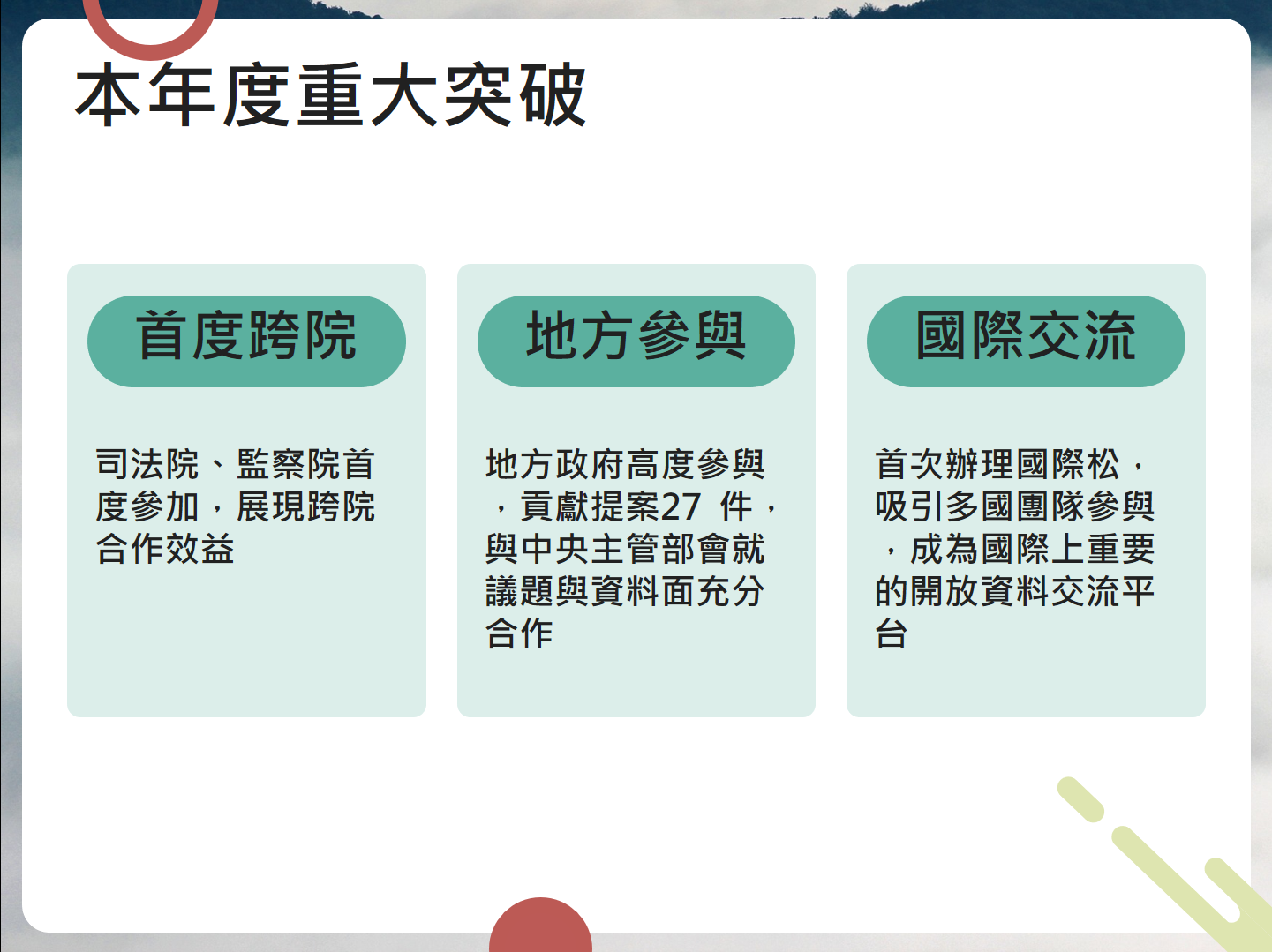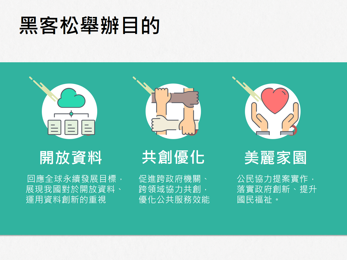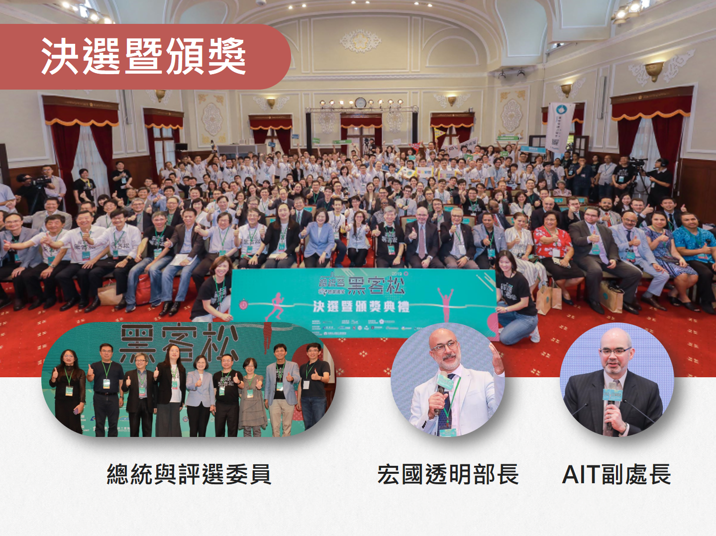今年活動以「智慧國家」為主題,透過跨機關、跨領域及公民協力,以黑客協作共創、分享的精神,實踐政府服務創新及優化,同時與國際連結。經過3個月緊鑼密鼓的實作與評選,選出國內5組、國外2組卓越團隊,榮獲蔡總統的獎勵。