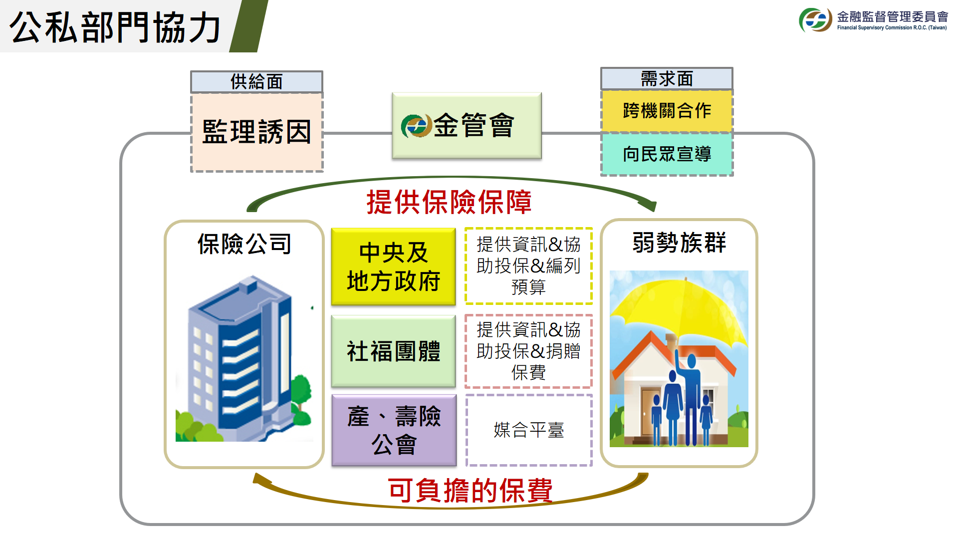 微型保險承保目標族群涉不同部會與地方政府業務,故微型保險之推廣,公部門間及公私部門間之合作至關重要。為有效提升微型保險目標族群與保險業者之對接,消弭供需落差,金管會除在需求面上積極透過拜會地方政府等,深化與相關政府部門之溝通聯繫,以及強化對民眾宣導外,在供給面上亦透過各式監理誘因,督促保險業者積極與擁有目標族群資訊之政府機關或民間團體合作。同時責成產、壽險公會於公會建立微型保險媒合平台,供有微型保險投保需求之政府機關、社福團體洽詢。
