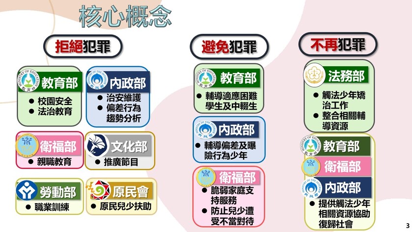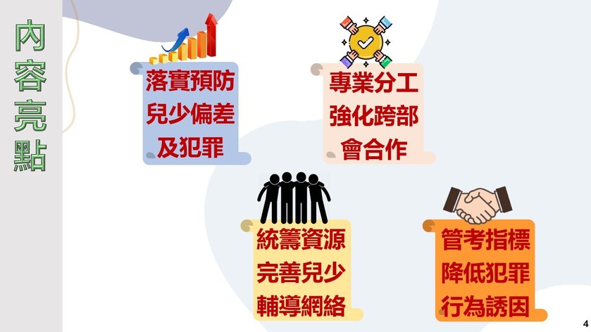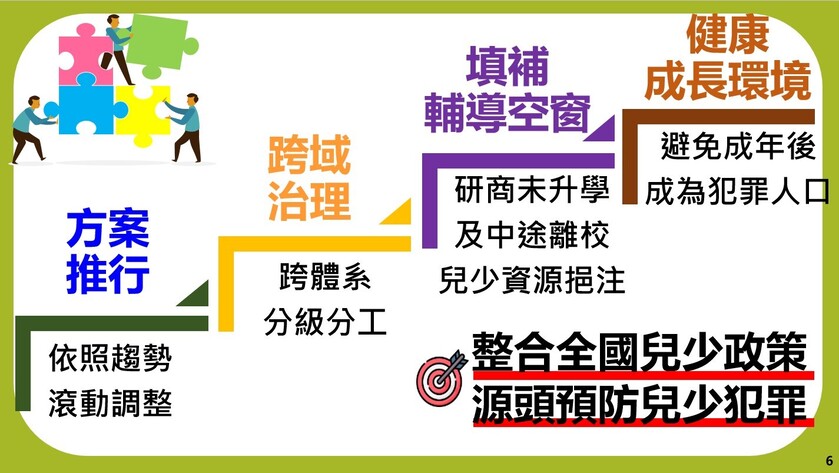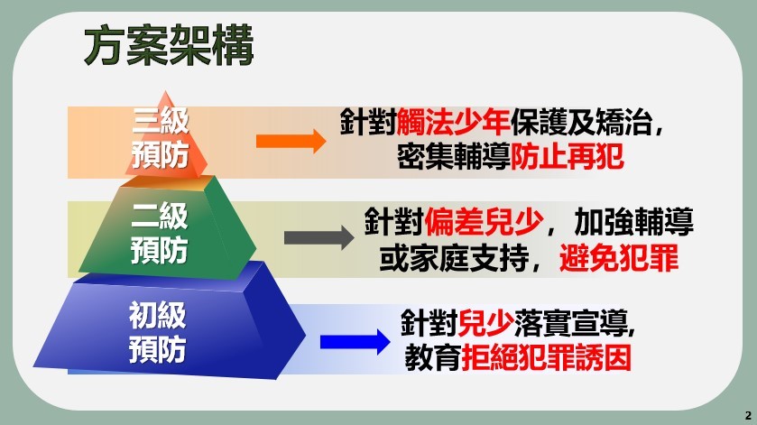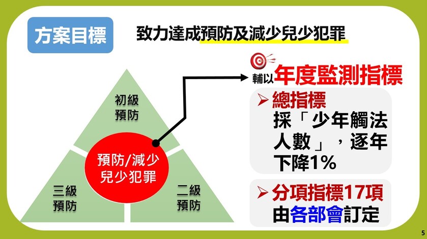 為展現政府保障兒童及少年身心健康發展決心,行政院於111年10月19日邀集相關部會召開「預防少年兒童犯罪方案」修正調整政策會議,經研議將方案名稱修正為「預防兒童及少年犯罪方案」,重新擬訂新架構及預防策略內容,以4年為1期,期盼將原先之預防策略改採跨體系多機構分級分工架構處理原則,建構完善之三級預防策略,並透過本次修正,整合國家在兒童及少年保護制度跨體系之相關資源,「預防」及「減少」兒少發生犯罪行為,避免其成年後,成為犯罪人口。