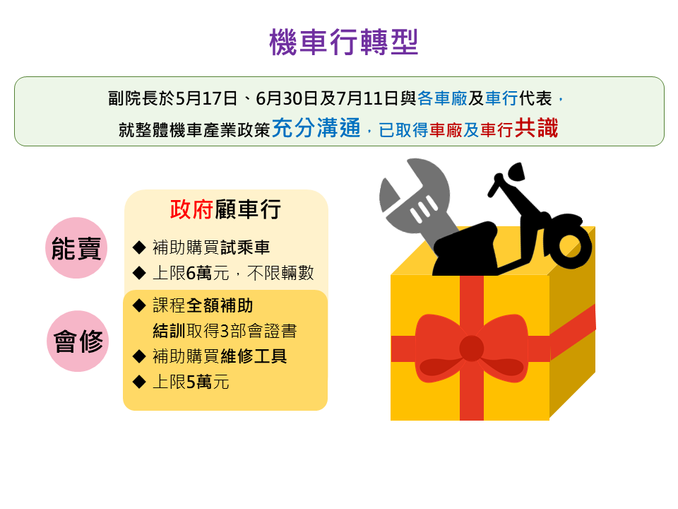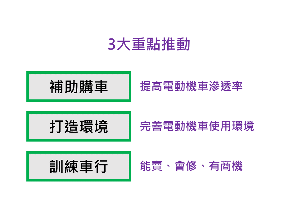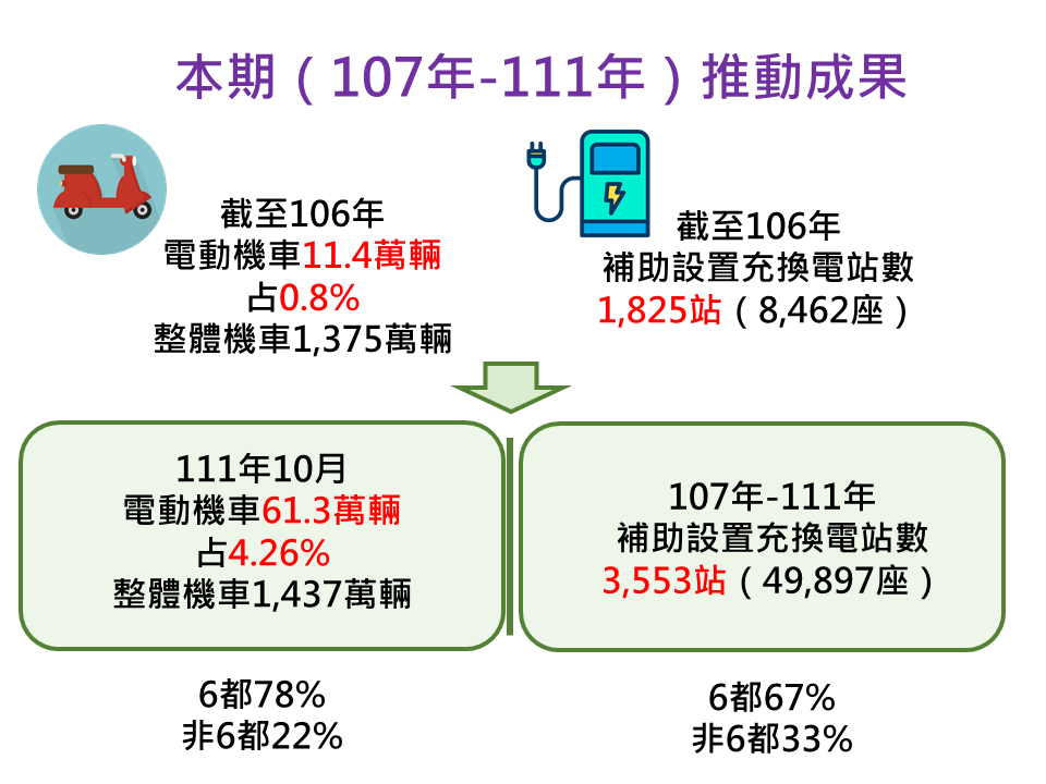 106年以前全台灣的電動機車大約有11.4萬輛,為加速普及電動機車,經濟部推動「電動機車產業創新躍升計畫(107-111年)」,至今已將電動機車掛牌量提高至61.3萬輛;後續將賡續推動「電動機車產業環境加值補助計畫(112-115年)」,以補助購車、打造環境及訓練車行等三大重點面向,不只是補助電動機車,扶助產業,走向淨零減碳,更要協助機車行轉型,讓機車行的師傅加入電車產業鏈,會修、能賣,同時,整體電動車環境的發展,尤其是充換電站,也要繼續建置。