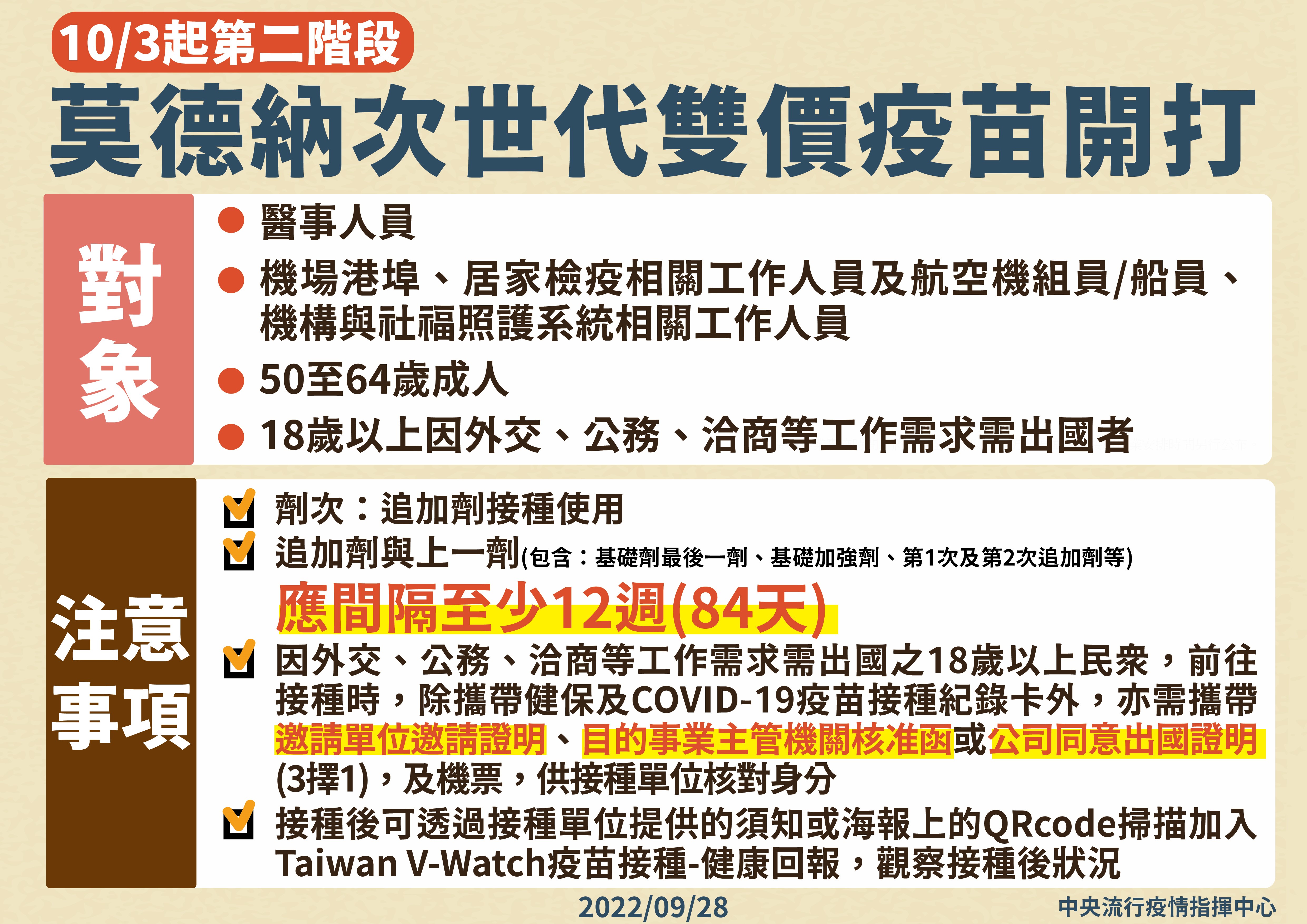 三、次世代疫苗接種:因應Omicron變異株影響及邊境逐步開放後可能之疫情衝擊,為儘速提升民眾抵抗Omicron變異株之免疫保護力,自本年10月3日起,開放第二階段對象追加接種Moderna次世代雙價疫苗,且與最後一劑基礎劑/基礎追加劑或前一劑追加劑應間隔至少12週(84天)。第二階段開放對象如下: