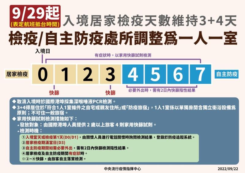 (一)第一階段:自9月29日零時起,入境檢疫措施維持3天居家檢疫及4天自主防疫,前3天居家檢疫處所調整為「1人1室」,及配合邊境取消唾液採檢,調增入境旅客家用快篩試劑檢測措施,於入境日及第3天檢疫期滿時快篩。