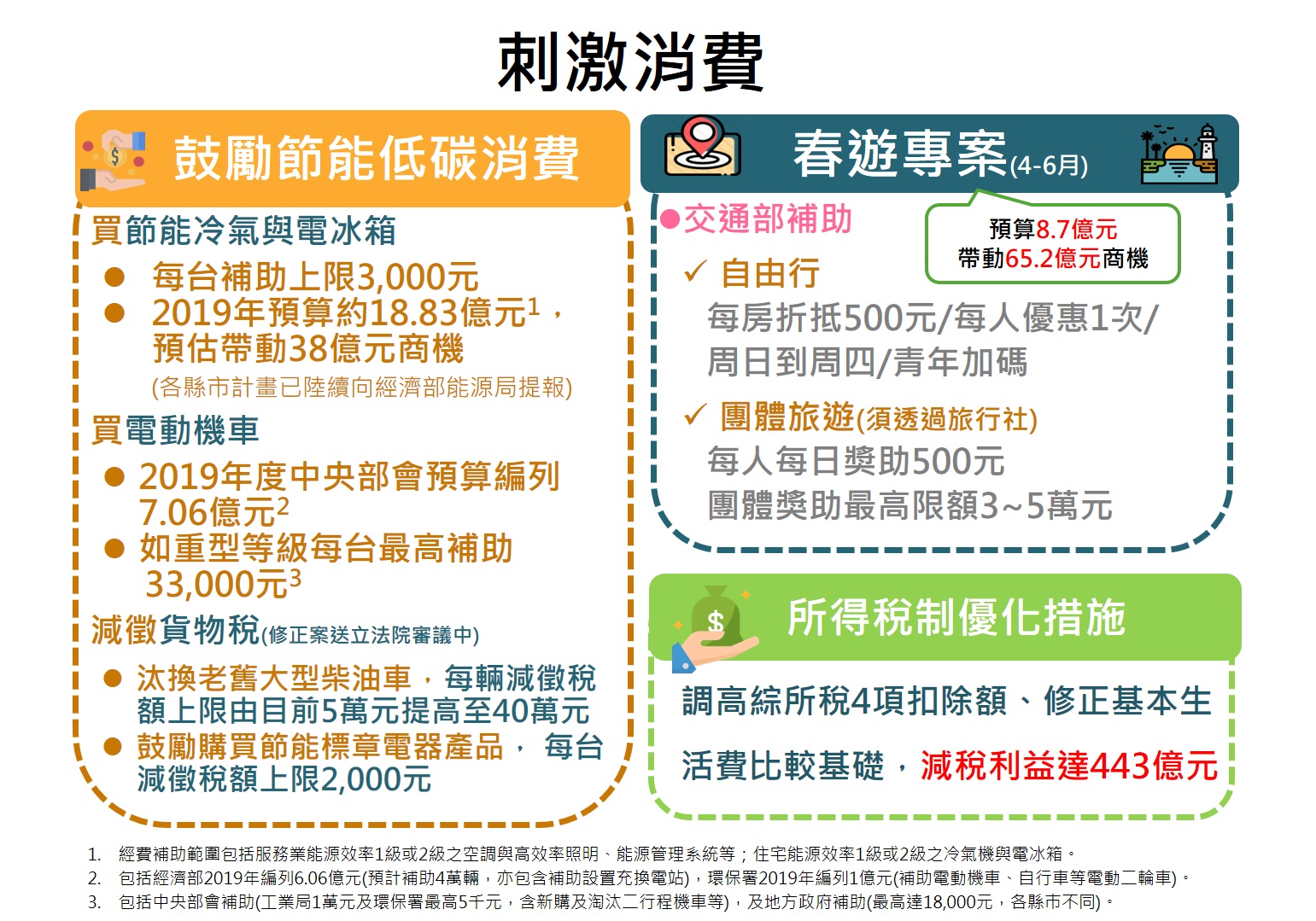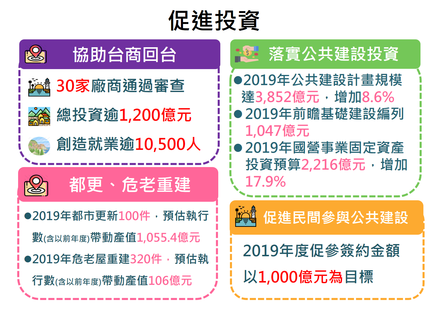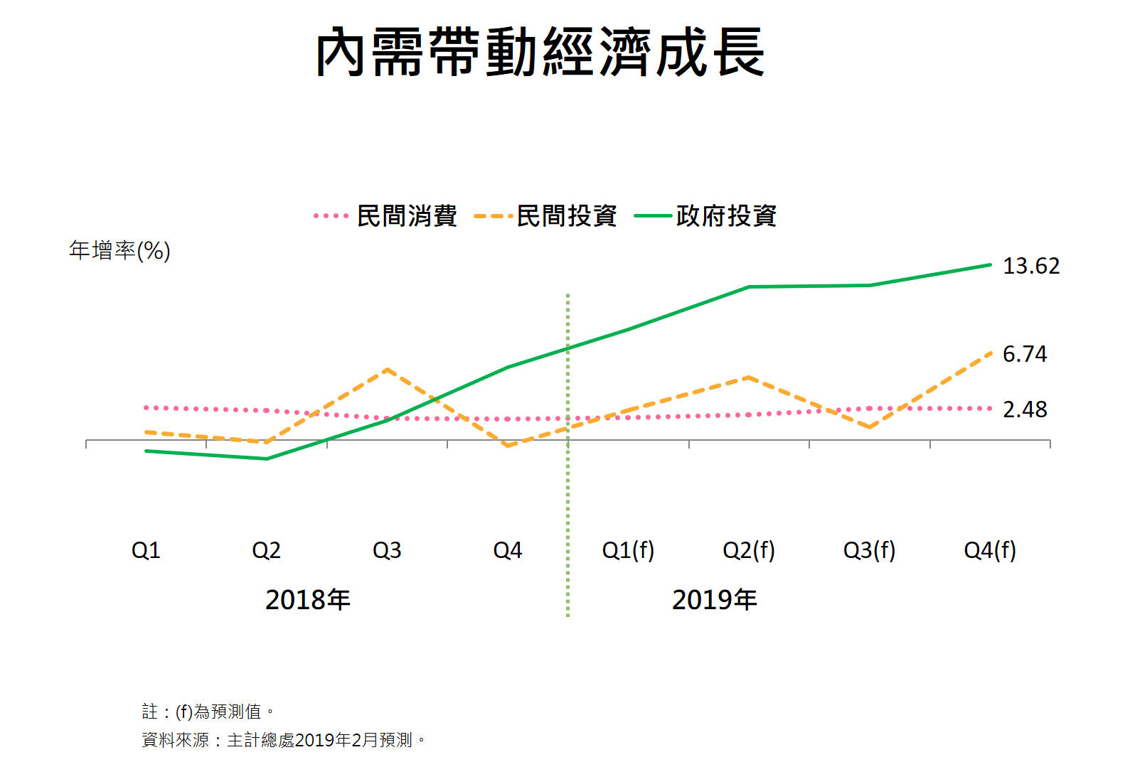 為因應國際環境潛存不確定性風險,內需為推升下半年經濟成長之主要動能,政府將嚴謹貫徹公共建設執行績效、加速促進台商回台投資,落實推動各項措施激勵民間消費,以提振內需成長動能,促進經濟穩健成長。