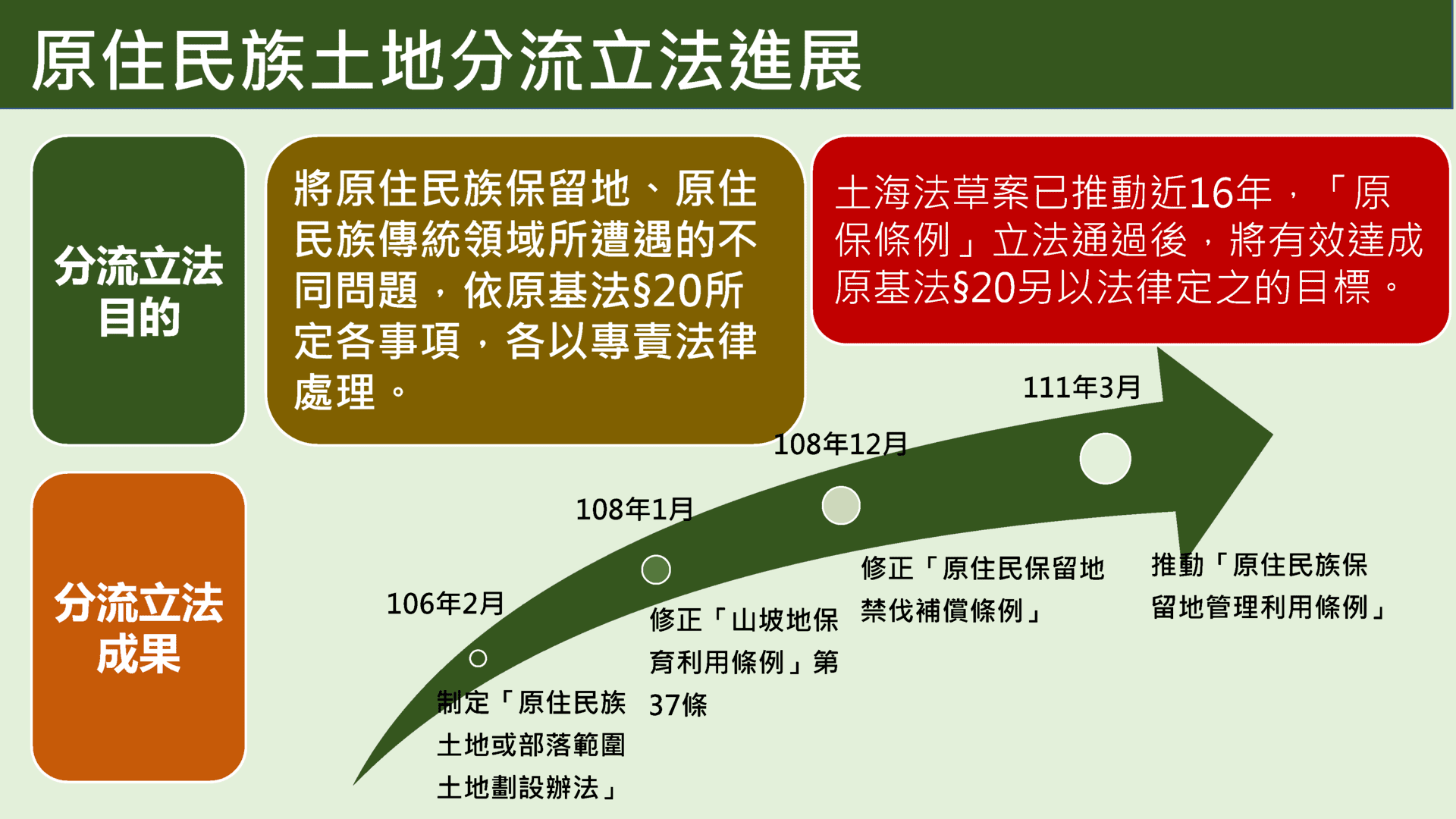 原民會以務實的政策思維,積極推動原住民族土地權益法制,於107年起採分流立法後,已完成山坡地保育利用條例第37條、原住民保留地禁伐補償條例之修法,有具體成果進展。