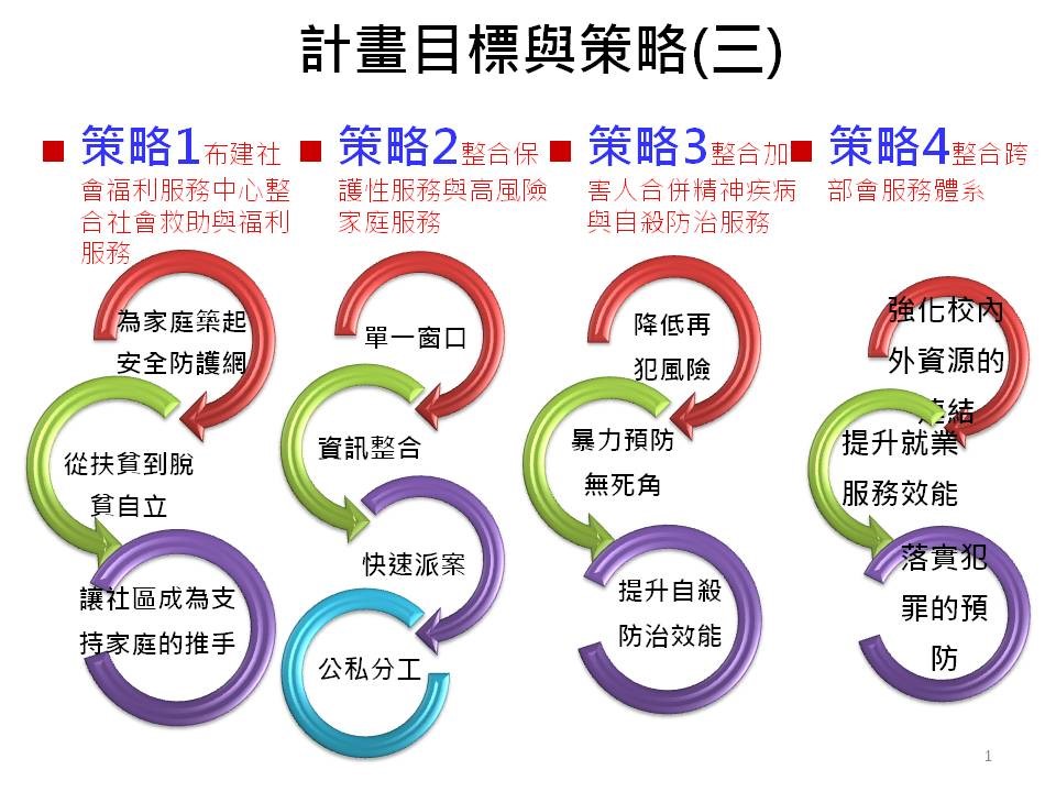 一、社會安全網所涉範圍廣泛,需跨部會同合力推動,為強化跨體系效能與服務串聯,完備社會安全網體系,將推動「強化社會安全網計畫(107-109年)」