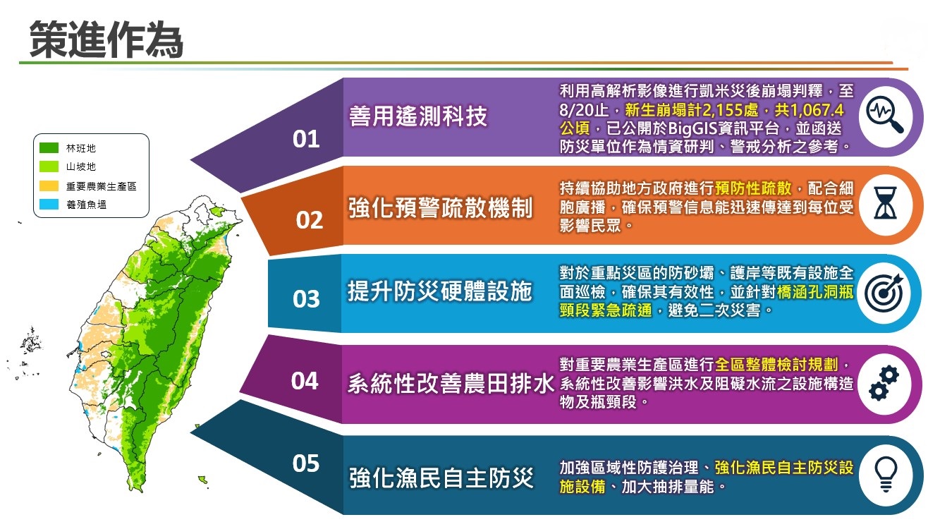 (二)強化預警及疏散機制:持續協助地方政府進行預防性疏散,並進一步完善細胞廣播系統,確保預警信息能迅速、準確傳達到每位受影響民眾。