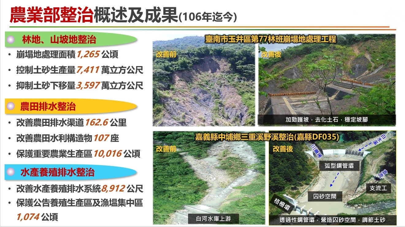 辦理山坡地水土保持、加強水庫集水區保育治理及縣市管河川及區域排水整體改善計畫-坡地水土資源保育等相關工作,106-113年達成清疏土砂量1,937.55萬立方公尺、控制土砂量7,411.12萬立方公尺。
