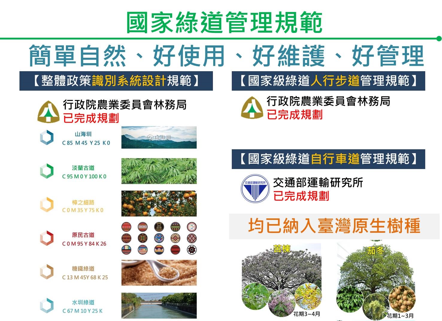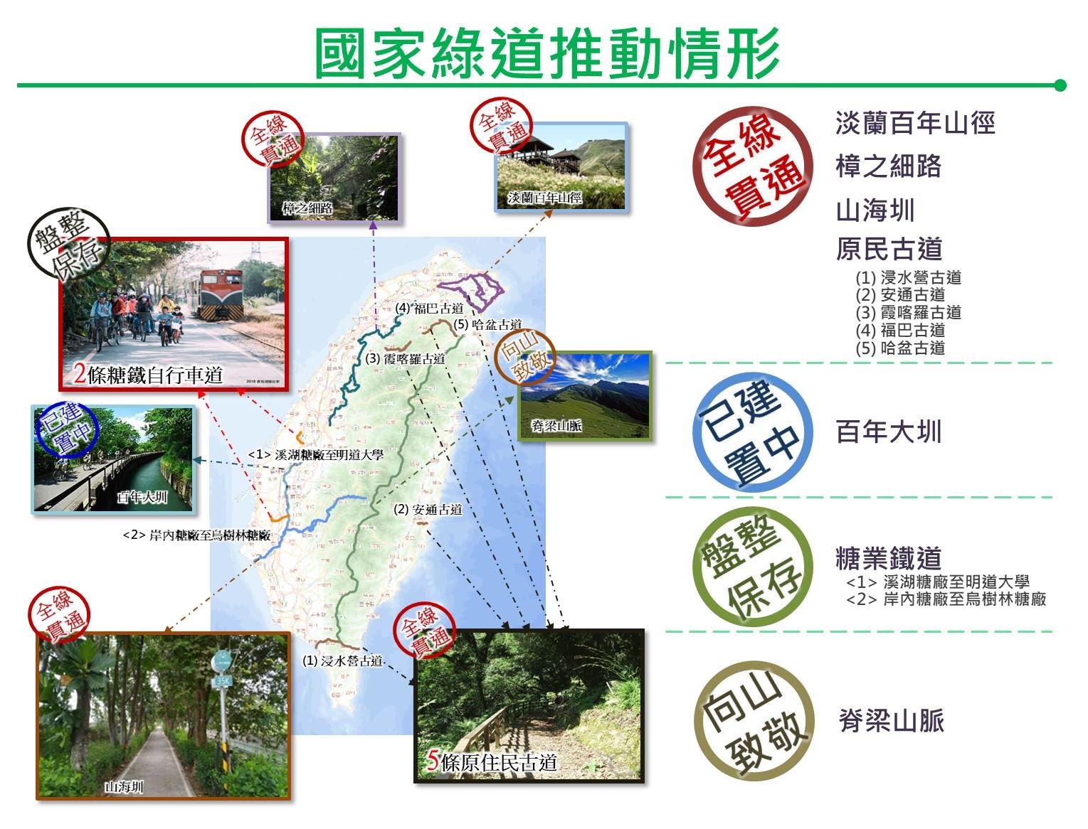 國家發展委員會規劃7條具發展潛力之國家級綠道主題軸線,以跨縣市且能彰顯該區域之代表性連續路線,涵蓋臺灣重要族群文化、水利建設、經濟產業、自然保育等主題面向,體現臺灣多元且豐富的資源與特色,並滿足觀光休閒遊憩需求。