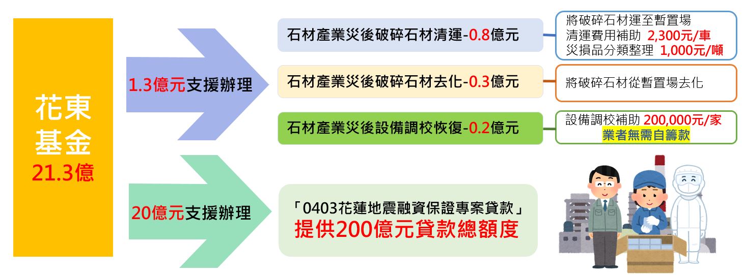 (四)產業升級轉型:將優先支持受0403花蓮強震受災之石材業者提案申請中小製造業低碳化及智慧化升級轉型個案補助。