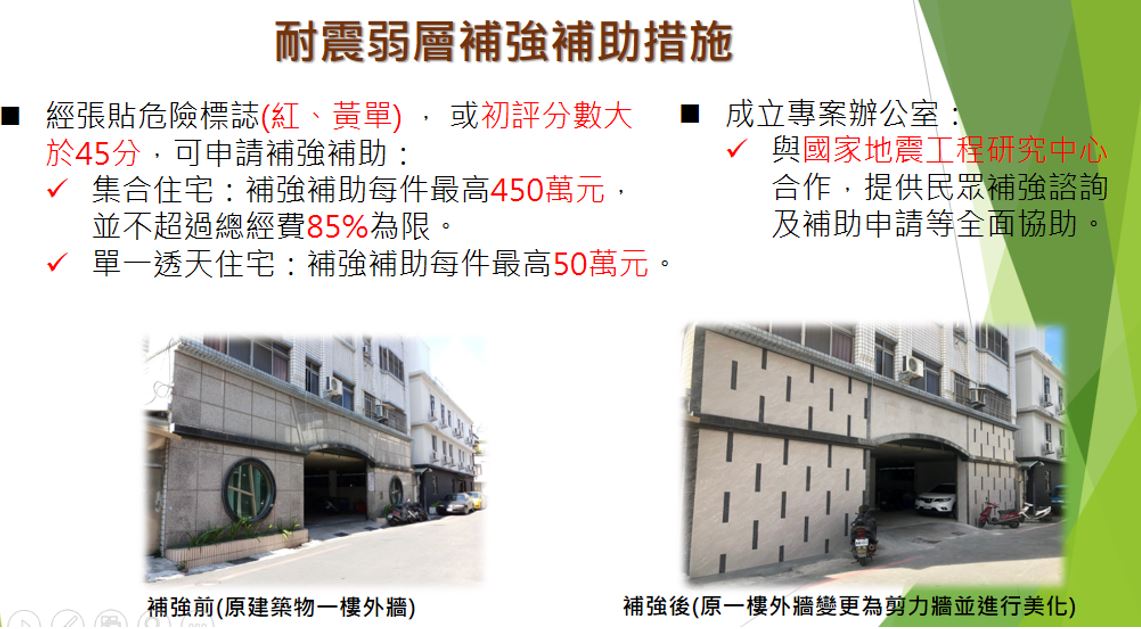(二)本次地震受損之集合住宅,內政部提供耐震弱層補強的補助,補助額度最高為450萬元,如屬單一透天住宅,最高補助50萬元。