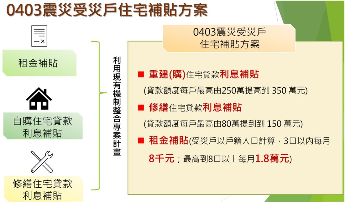 4、研擬0403震災受災戶住宅補貼方案報院核定實施。