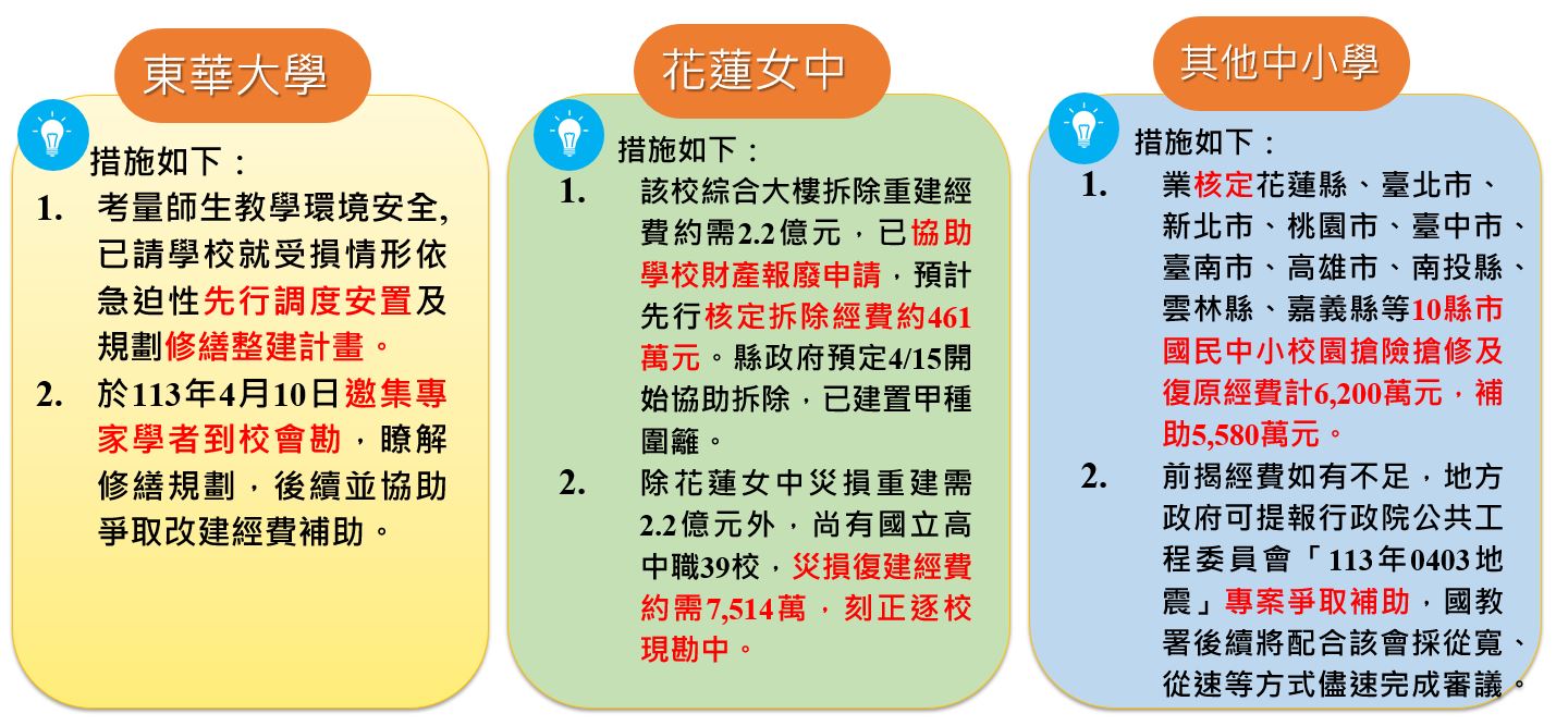 (二)教育部持續掌握全國各級學校建築物受損情形,並攜手各縣市政府及學校完成復原重建工作,落實校園防災教育,提升學校災害管理量能,以實踐韌性防災校園與扎根防災教育目標。