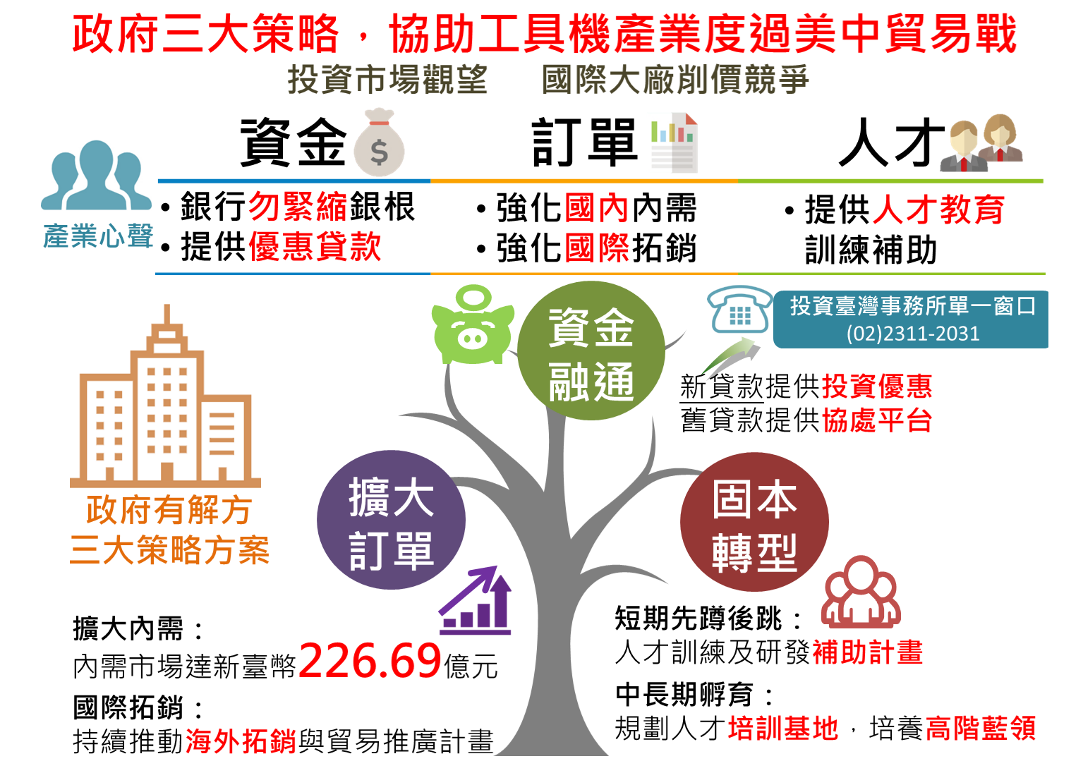 為協助我國工具機產業因應美中貿易戰影響的衝擊,將跨部會整合資源,以「資金融通」、「擴大訂單」、「固本轉型」等策略適時協助產業持續穩定發展。內容說明如下: