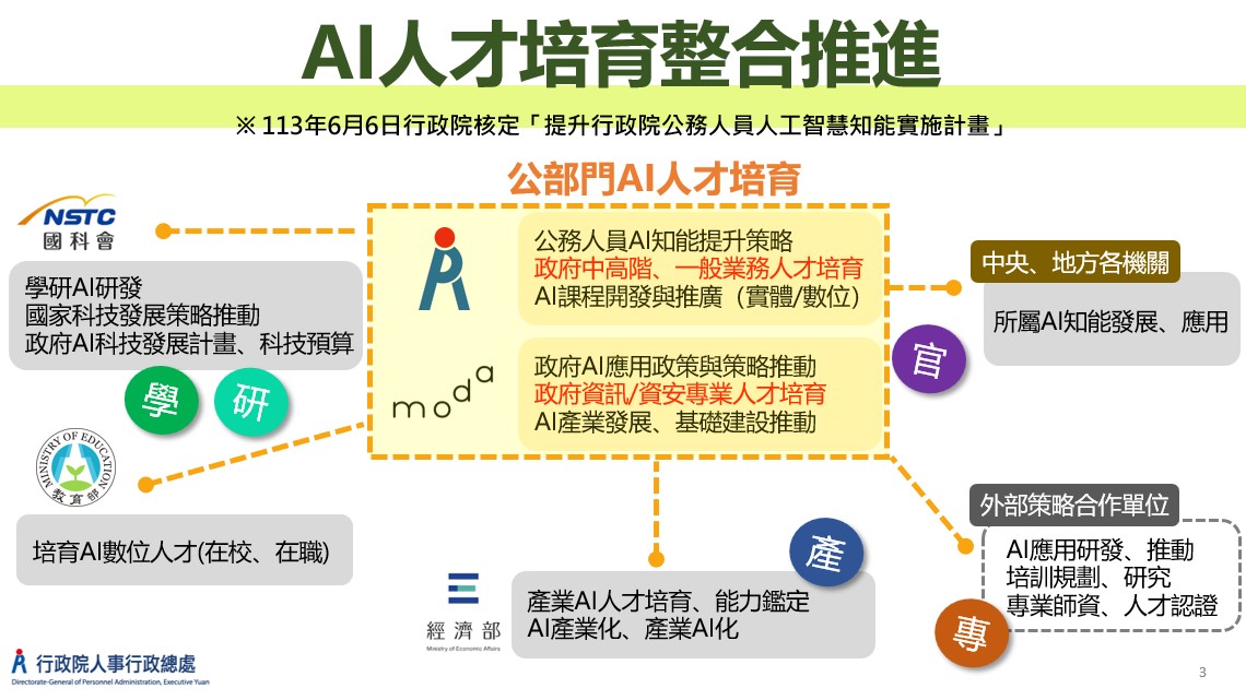 三、在培育高階主管部分,人事總處於113年7月至10月間辦理4場次「高階人才AI共識營」,協助政府高階主管掌握AI發展趨勢及應用策略,建立高階文官運用AI優化政府治理共識。在培育中階人才部分,為進一步培養各機關具備AI發想及應用導入能力的關鍵人力,人事總處已辦理2期「AI推動實務種子人才認證班」,以科長級以上中階業務單位主管為主要調訓對象,採設計思考及系統思考工作坊形式,以實戰操作構思AI創新公共服務方案,並輔導考取AI素養專業證照,預計至今(114)年底培訓各機關AI推動種子人才共216人。
