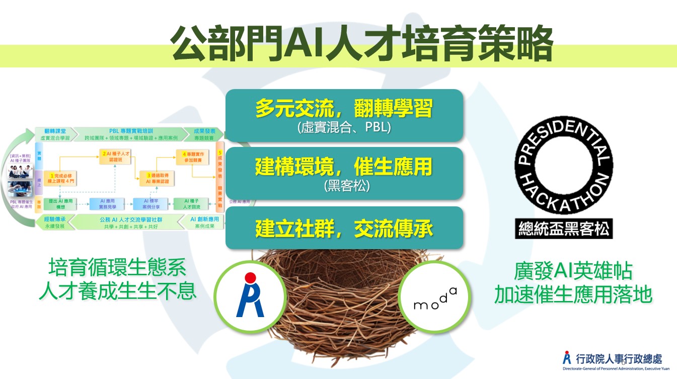 五、為持續提升我國全體公務人員AI知能,以帶動政府機關智慧轉型,人事總處自今年起結合專業機構規劃執行「AI 政府領航人才發展計畫」,並獲科技發展基金計畫補助,今年為先期規劃階段,規劃方案將於115年至119年間逐年推展落實,打造完善的AI人才培育循環生態系,以達成政府部門運用提升行政效能、創新公共服務及優化政府治理的目標。