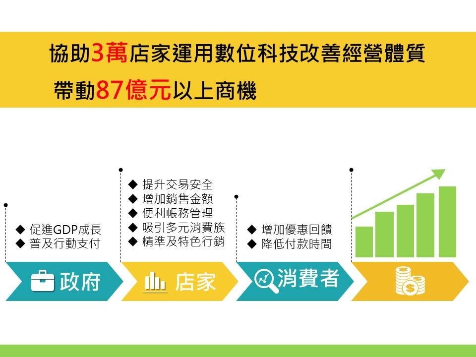 1、透過「租金補助」,補助店家租用數位服務系統,如線上點餐、雲端收銀及電子優惠券等數位服務方案。