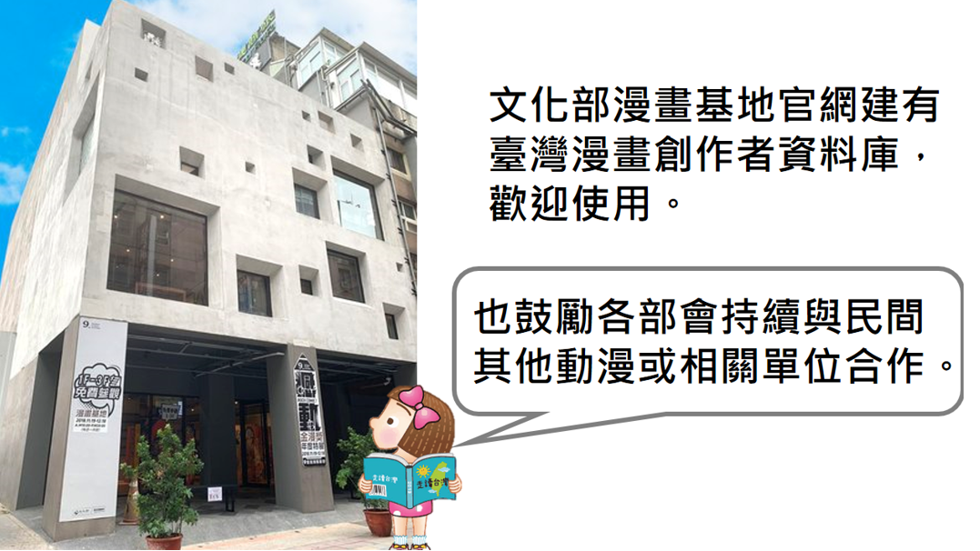 文化部漫畫基地官網建有臺灣漫畫創作者資料庫,也歡迎各部會及民間持續參考運用。