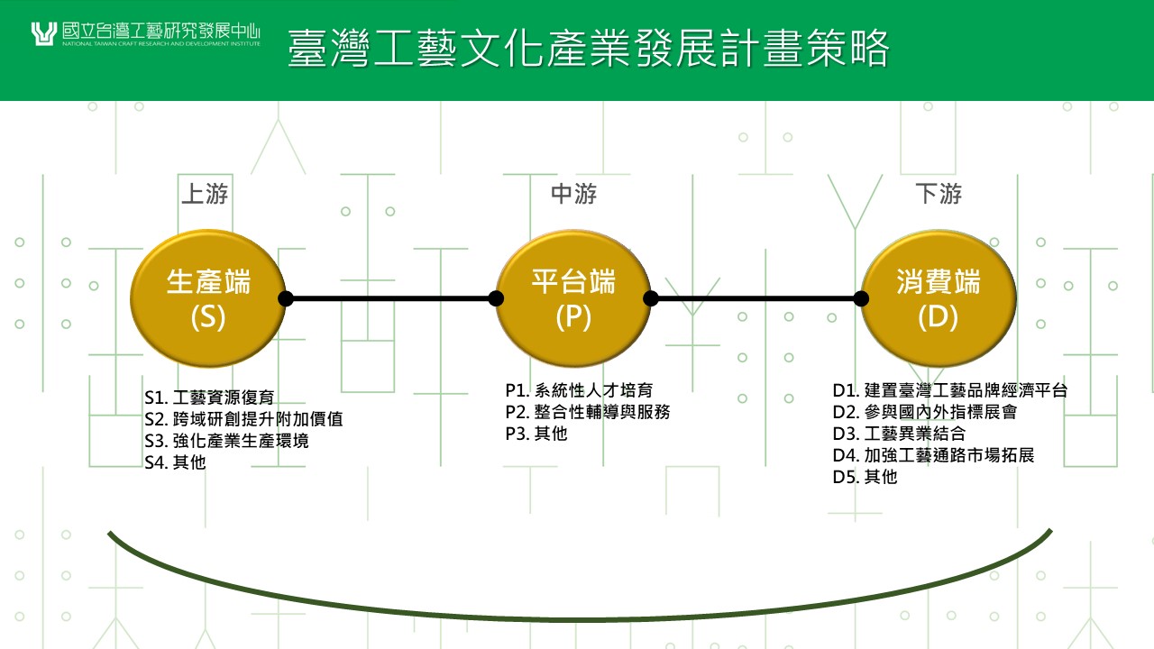 (一)生產端策略:將協助工藝資源復育、導入跨域合作,結合創意設計、科技應用及數位加值,並協助改善產業生產環境。