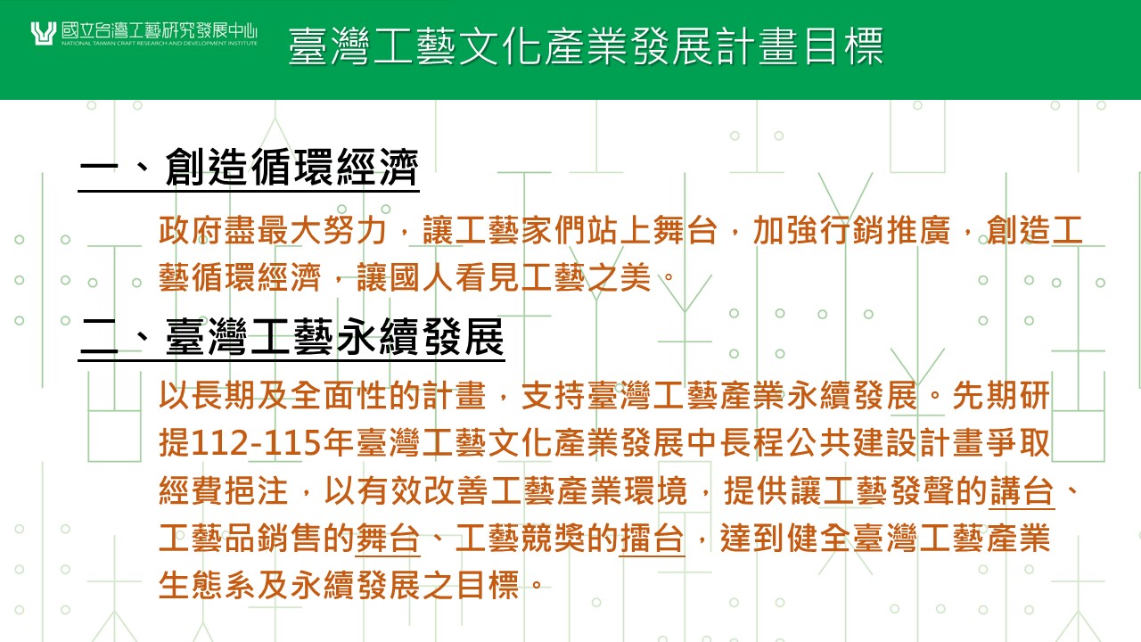 二、文化部將透過與內政部、衛福部等部會合作,鼓勵村里長參觀、工藝老師為銀髮族授藝也行銷作品、製作精美工藝月曆...等方式,協助工藝品行銷,並創造工藝循環經濟;另以長期及全面性的計畫,支持臺灣工藝產業永續發展。文化部另致力改善工藝產業環境,提供讓工藝發聲的講台、工藝品銷售的舞台、工藝競獎的擂台,達到健全臺灣工藝產業生態系及永續發展之目標。