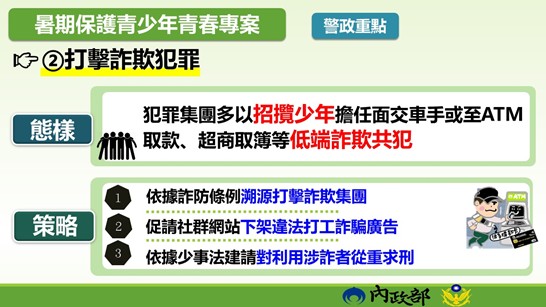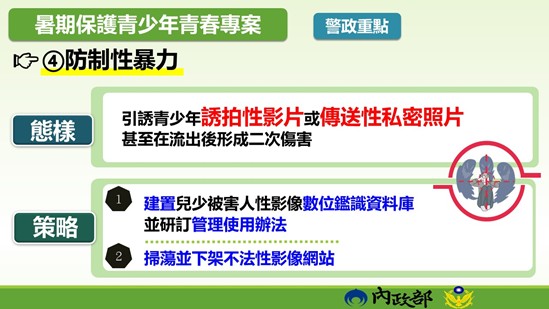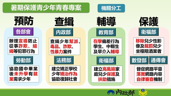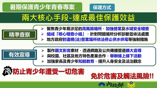 為於暑假期間加強保護青少年安全,避免遭受安全及不法危害,行政院責由內政部規劃「114年暑期保護青少年青春專案」,彙整各部會暑期相關保護措施,包含於「精準查察」面請有關機關透過營業稽查、勞動稽查、安全檢查等手段,強化營業場所及水域安全;透過危險駕駛裁罰、道安講習等裁罰性不利處分,避免青少年致生安全危害;透過刑事調查、查緝、起訴,使青少年易涉入或遭利用犯罪行為得獲抑制。另於「有效宣導」面請有關機關藉由辦理實體或網路活動設定適當客群、場所,對於人身安全、婦幼安全、勞動安全、網路安全要點精準投放,增加家長及青少年知能,避免遭受不法及安全危害,亦避免少年曝露觸法風險及預防涉入犯罪。