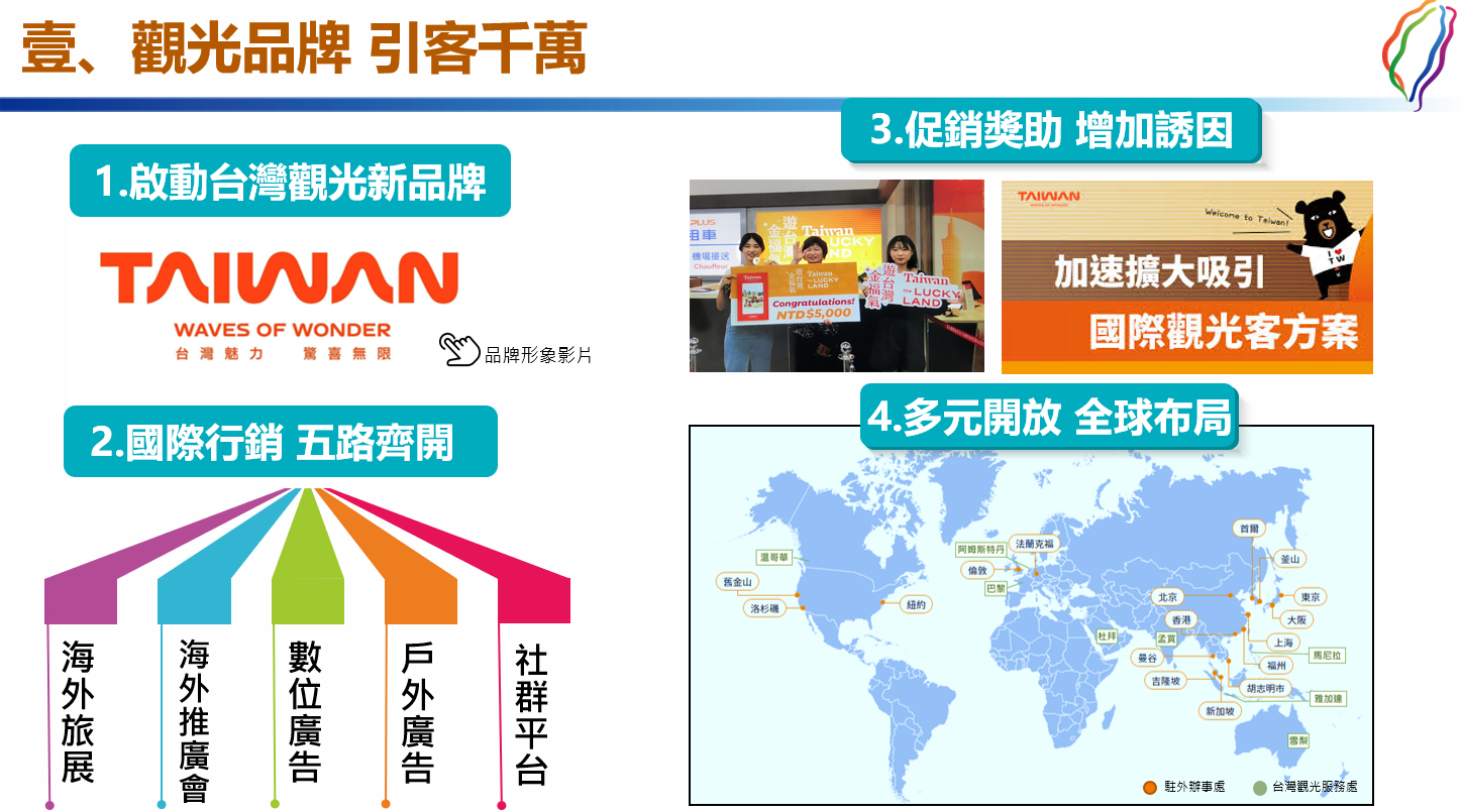 推出台灣觀光新品牌「TAIWAN– Waves of Wonder」(台灣魅力.驚喜無限),透過海外旅展、推廣會、數位廣告、戶外廣告及社群平台等,國際行銷五路齊開,並增加獎助誘因、全球拓點布局,擴大吸引國際旅客來台。