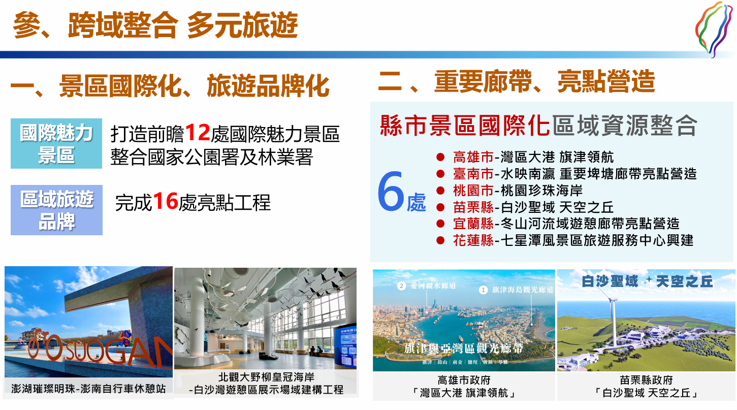 打造前瞻12處國際魅力景區,攜手地方政府串聯景點,完成16件亮點工程及6處重要廊帶亮點營造。