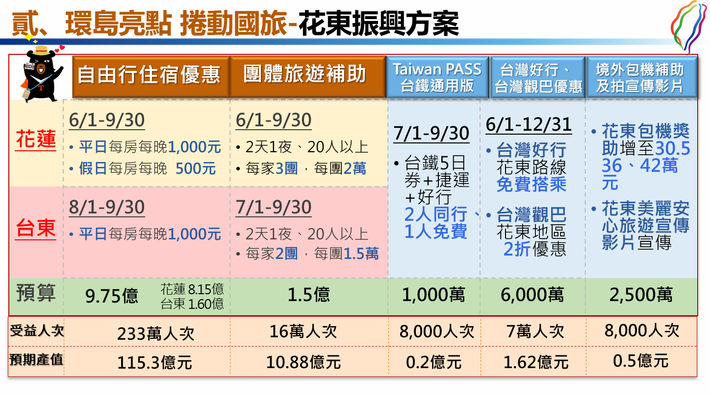 為振興花東觀光,推出團體旅遊補助、自由行住宿、台灣好行及台灣觀巴等優惠方案,預計帶動自由行233萬人次、團體旅遊16萬人次,創造新台幣126億元以上商機。