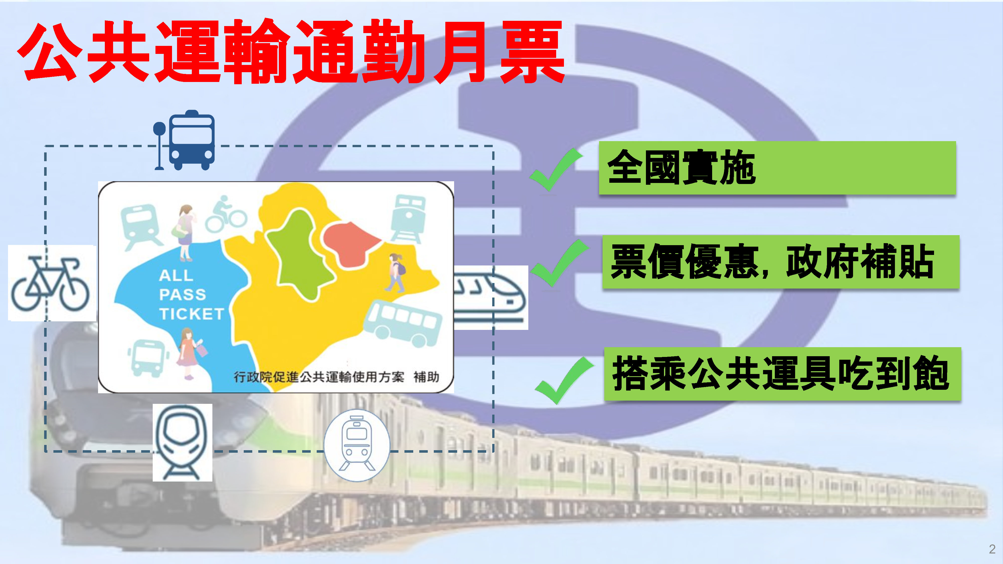 依照交通部規劃「促進公共運輸方案」內容,三大都會生活圈(北北基桃、中彰投苗、南高屏)因生活環境條件緊密連結,此類生活圈將規劃通勤月票優惠措施,並建議可提供民眾通勤月票優惠,如北北基桃推動1200月票,30天內無限次搭乘生活圈內公車、客運、捷運、台鐵及公共自行車等運具;中彰投苗及南高屏生活圈研議採「城際通勤」、「都市內通勤」兩種月票;在其他縣市部分,則可依單一縣市或與鄰近縣市之緊密程度及運具條件,因地制宜採「單一訂價」或「城際通勤」、「都市內通勤」兩種月票。另外在觀光景點公共運輸提升部分,則規劃提升台灣好行優化服務及觀光路廊在地有腳接駁服務,將提供優惠促銷方案並擴大整合行銷宣傳,強化旅遊便利性與景點串聯功能。