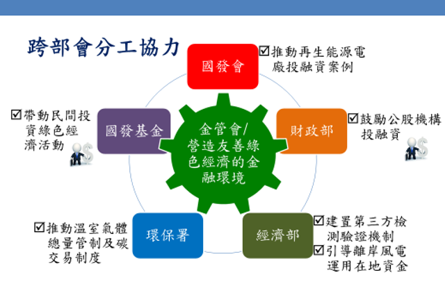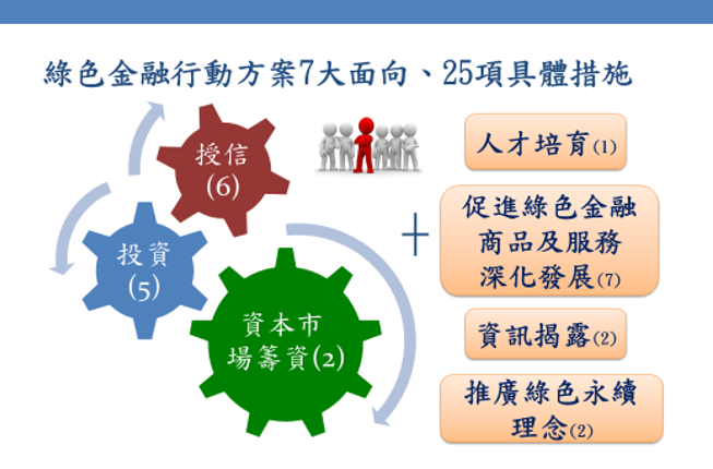 為營造國內有利發展綠色金融環境,鼓勵金融業發展綠色金融,行政院於106年11月6日核定金管會擬具之「綠色金融行動方案」,並由金管會、經濟部、財政部、國發會、環保署、國發基金等部會,共同協力合作推動。方案具體推動內容包括:授信、投資、資本市場籌資、人才培育、促進綠色金融商品或服務深化發展、資訊揭露、推廣綠色永續理念等7個面向,計25項措施,預期將達到協助能源與產業轉型及發展綠色金融之效益。