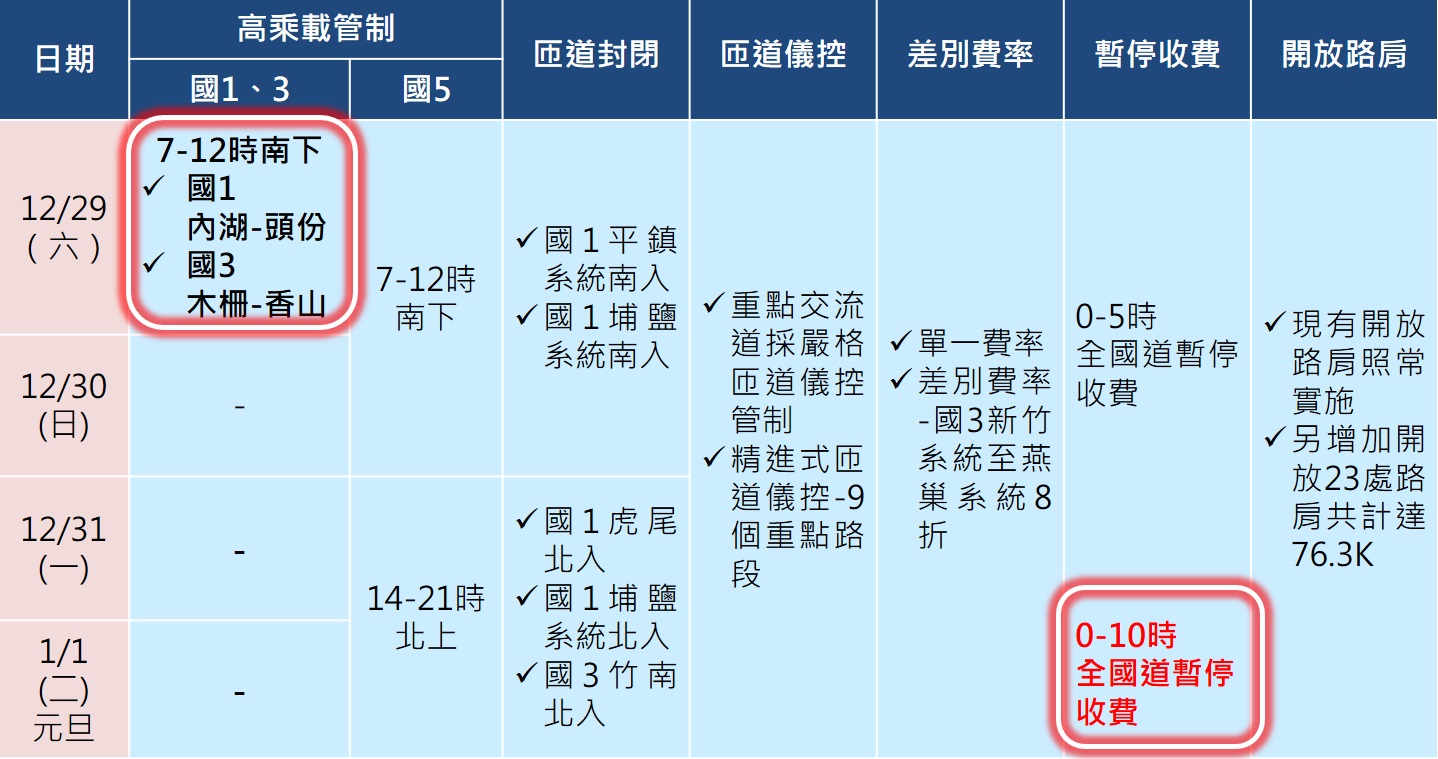六、國道除實施匝道封閉、入口高承載管制及匝道儀控外,另12月29日至31日,每日0-5時,國道全線雙向暫停收費,並於假期最後1日(元旦)試辦當日0-10時國道全線暫停收費措施,轉移連假第3日及最後1日下午北返壅塞車潮。